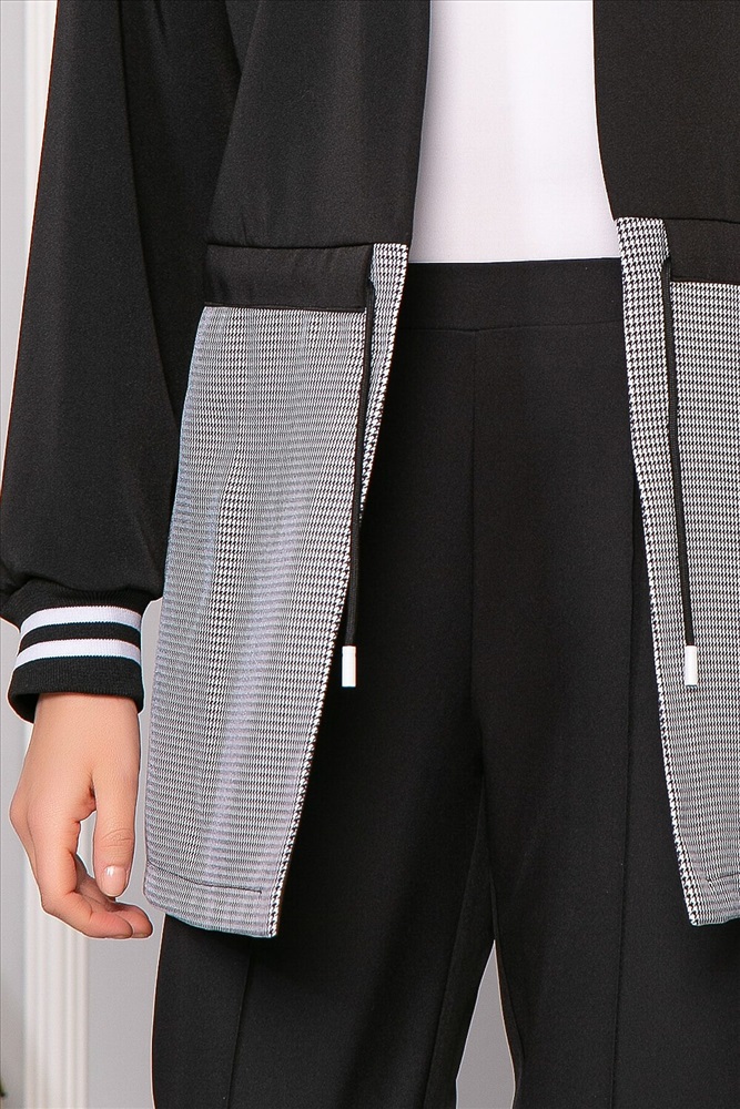 ID товара: 835799 Состав: 97% Полиэстер, 3% Эластан Сезон: Осень/Зима Длина: Средняя Фасон: Свободный крой Рукав: Длинные Вид застежки: Завязка на кулиску Вырез горловины: V-образный Рисунок: Гусиная лапка Основная ткань: Полиэстер Стиль: Повседневный Страна бренда: Россия Страна производства: Россия Артикул: Б5072. Ткань: костюмная. Состав: 97% п/э, 3% эластан. Цвет: чёрный, серый. Принт: гусиная лапка. Вид застежки: кулиска. Силуэт: свободный. Карманы: нет. Длина изделия жакет по спинке: 46/ 71 см, 48/ 75 см, 50/ 77 см, 52/ 79 см, 54/ 81 см, 56/ 83 см. Длина рукава: 46/ 66 см, 48/ 66 см, 50/ 66 см, 52/ 67 см, 54/ 67 см, 56/ 67 см. Рост модели: 168 см. Жакет из костюмной ткани в сочетании чёрного и серого цветов выглядит стильно и очень эффектно. Нижняя часть жакета выполнена из ткани с принтом "Гусиная лапка". Пояс-кулиска позволяет подчеркнуть талию. Рукав и отделка воротника оформлены черной мягкой резинкой. Линий плеча спущена. Уход за изделием: бережная стирка до 30 градусов; нельзя отбеливать; деликатный отжим; гладить при t не более 110 С; гладить с изнанки. *Допуск отклонения длины при массовом производстве 1-3 см является нормой. Комментарии к товару