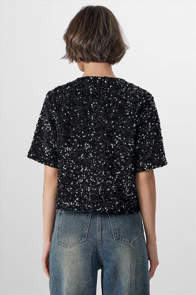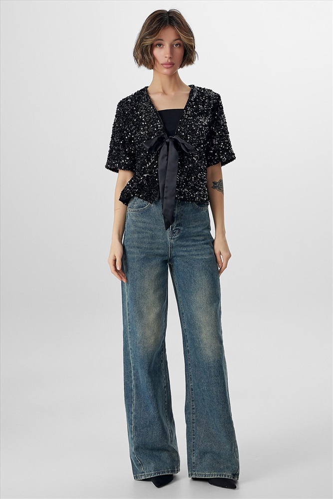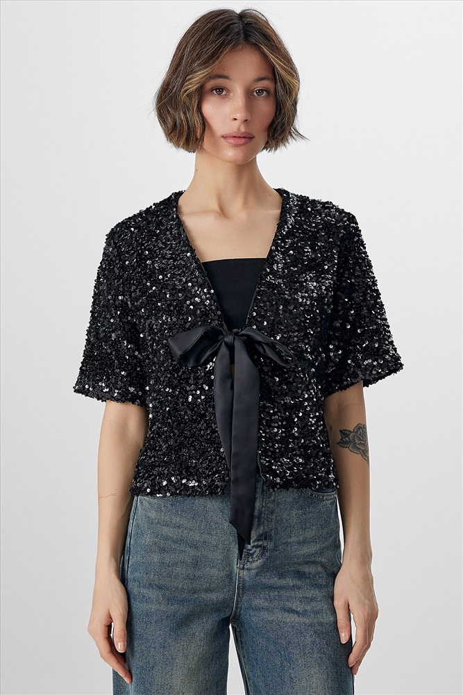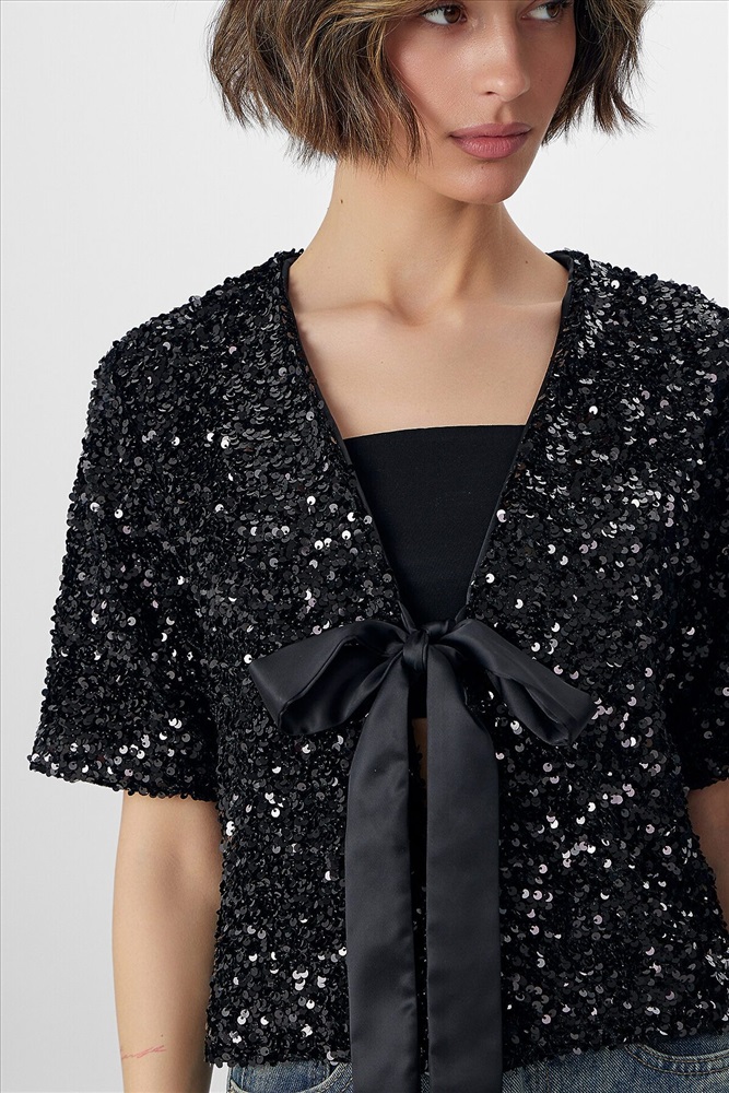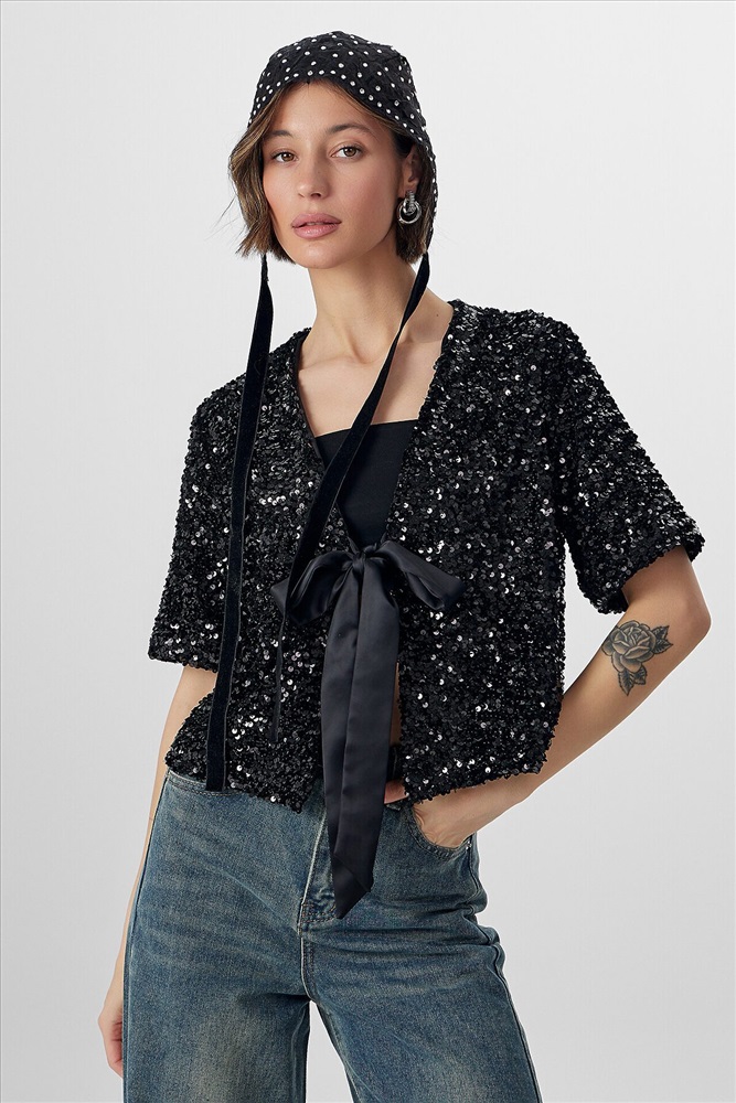 Жакет женский, выполнены из трикотажного полотна велюр с пайетками. Жакет прямой, свободный, укороченный. Горловина V-образной формы. Рукава втачные, длиной до локтя. Жакет на подкладке из сатина. По переду завязки из репсовой ленты на бант.