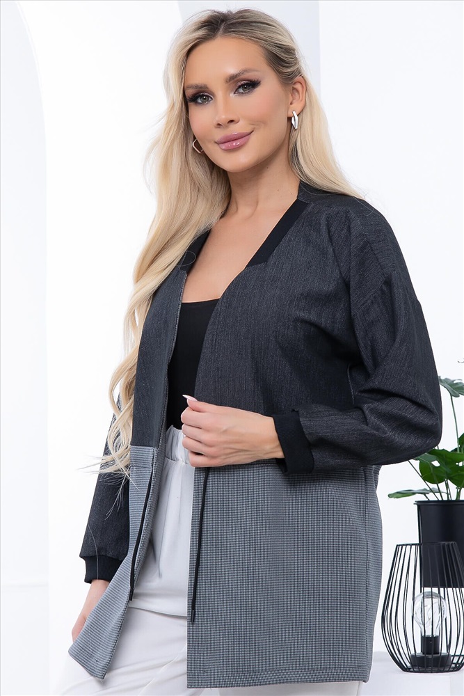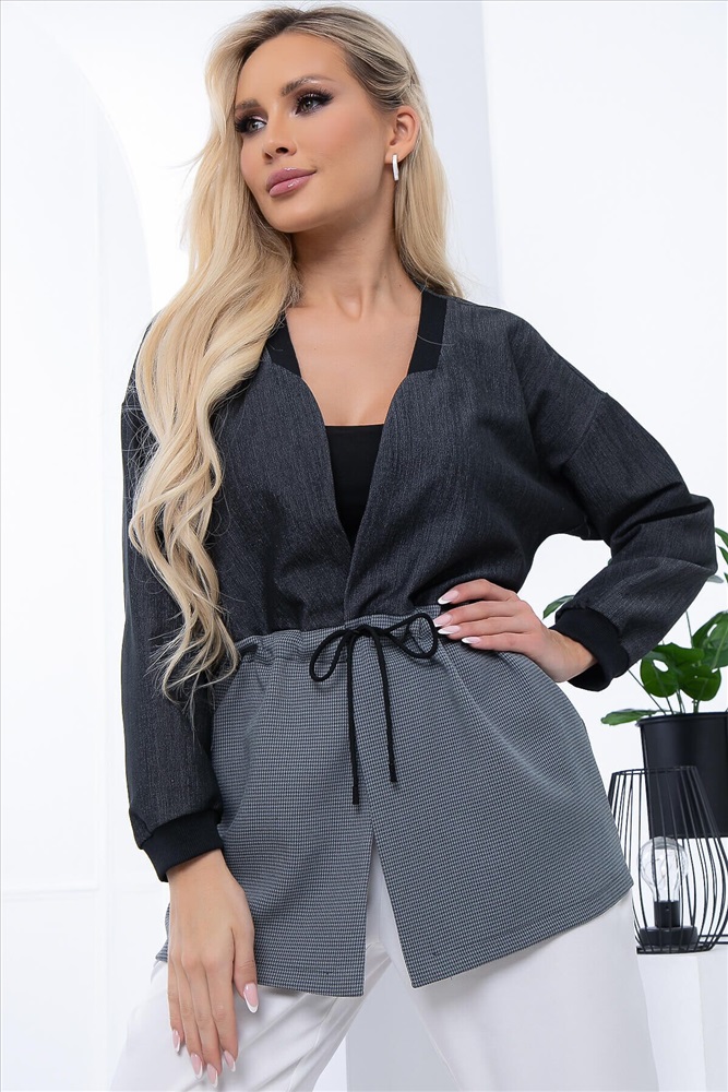 Артикул: Б6735. Ткань: костюмная. Состав: 60% п/э, 35% вискоза, 5% эластан. Цвет: графит. Вид застежки: кулиска на талии. Силуэт: свободный. Карманы: отсутствуют. Длина изделия жакет по спинке: 46/ 71 см, 48/ 75 см, 50/ 77 см, 52/ 79 см, 54/ 81 см, 56/ 83 см. Рост модели: 168 см.