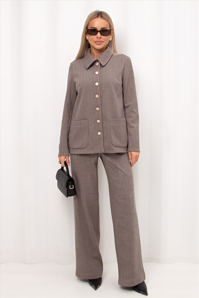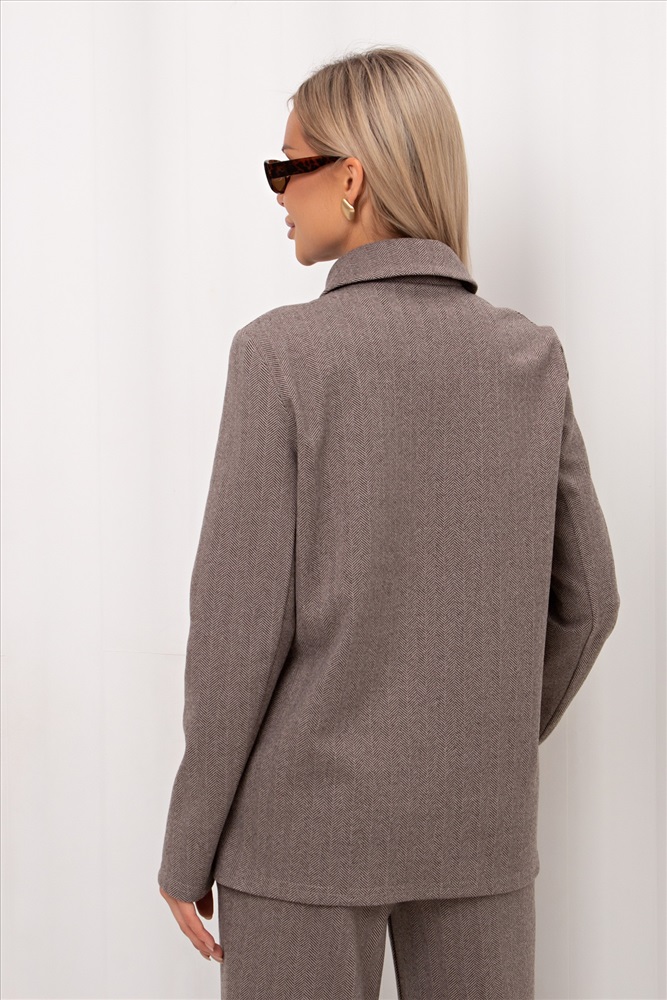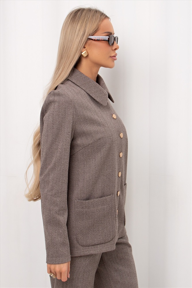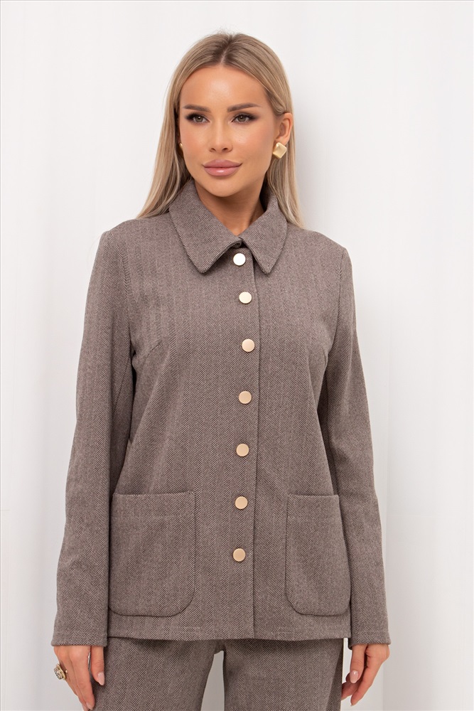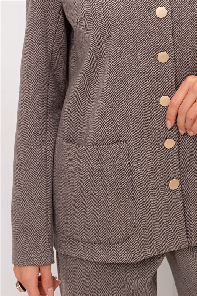Комфортный жакет прямого силуэта из утепленного костюмного трикотажа в «ёлочку». Длинный втачной рукав. Отложной воротник. По переду накладные карманы. По центру переда застежка на петли и пуговицы. Модель без подкладки.