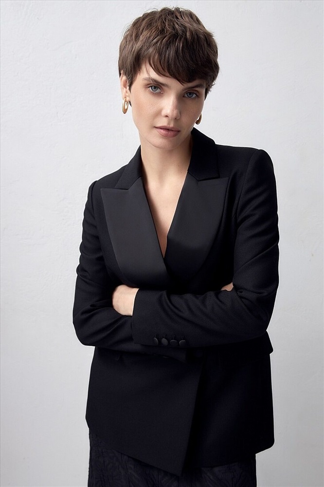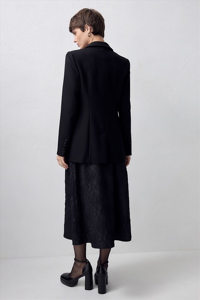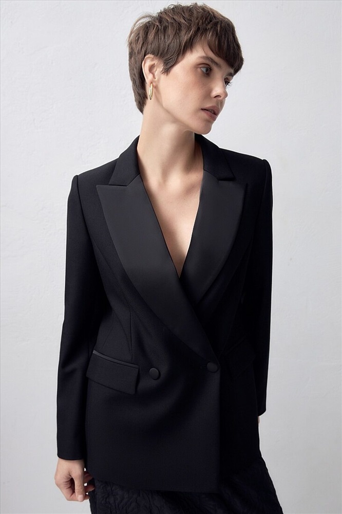 Классический двубортный жакет на одной пуговице приталенного силуэта с втачным плечом и акцентными лацканами из атласной ткани. Жакет имеет два прорезных кармана с клапанами. Вечернюю группу составляет с брюками из одной ткани.