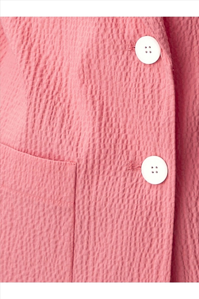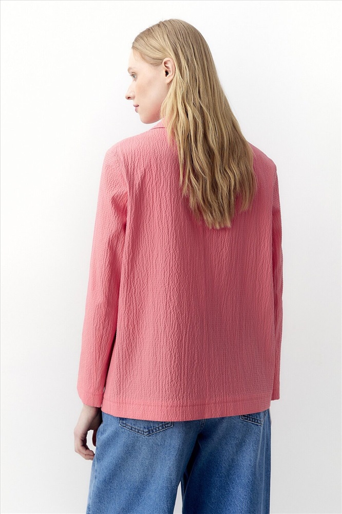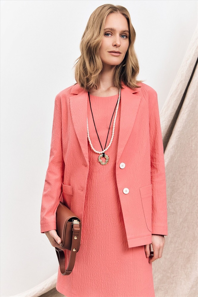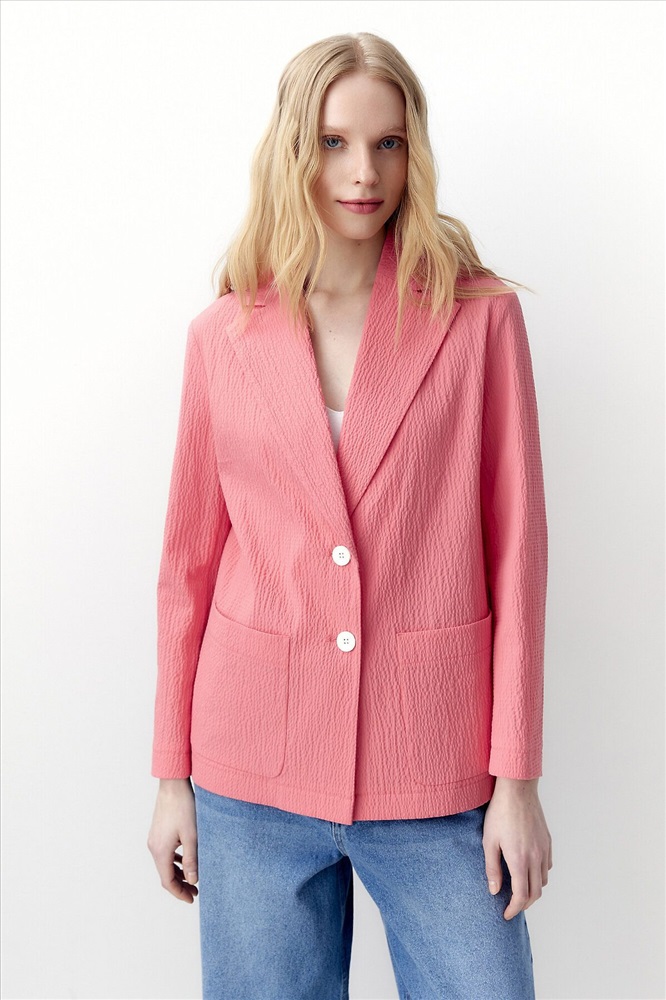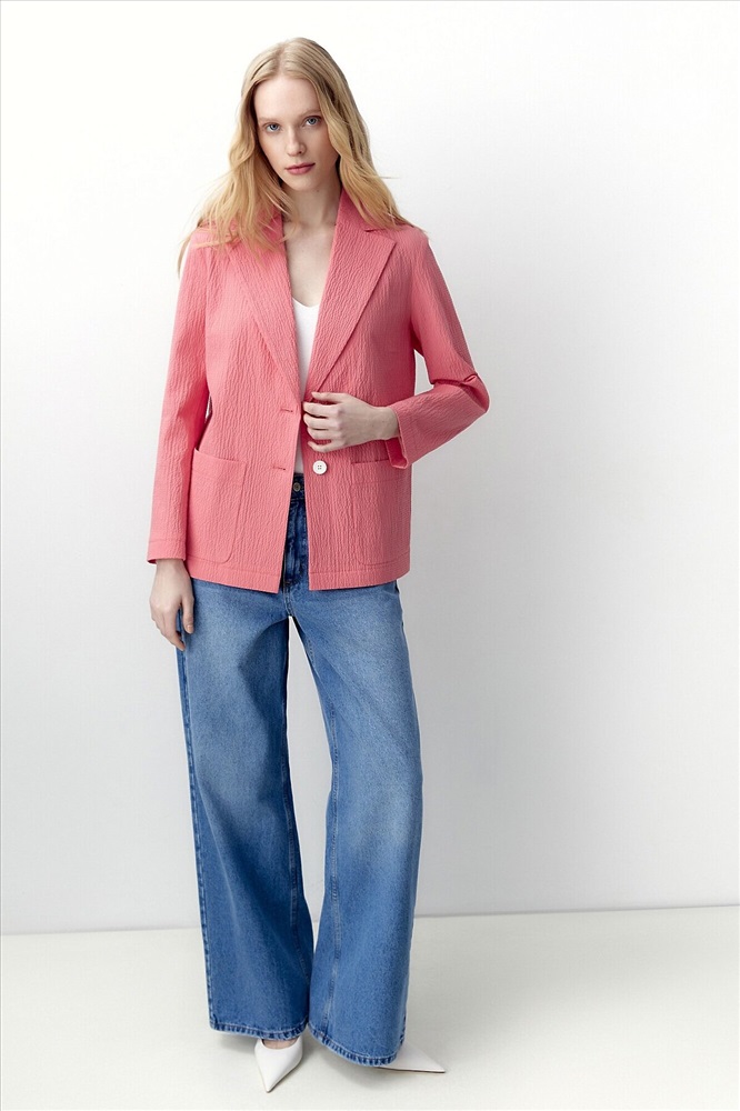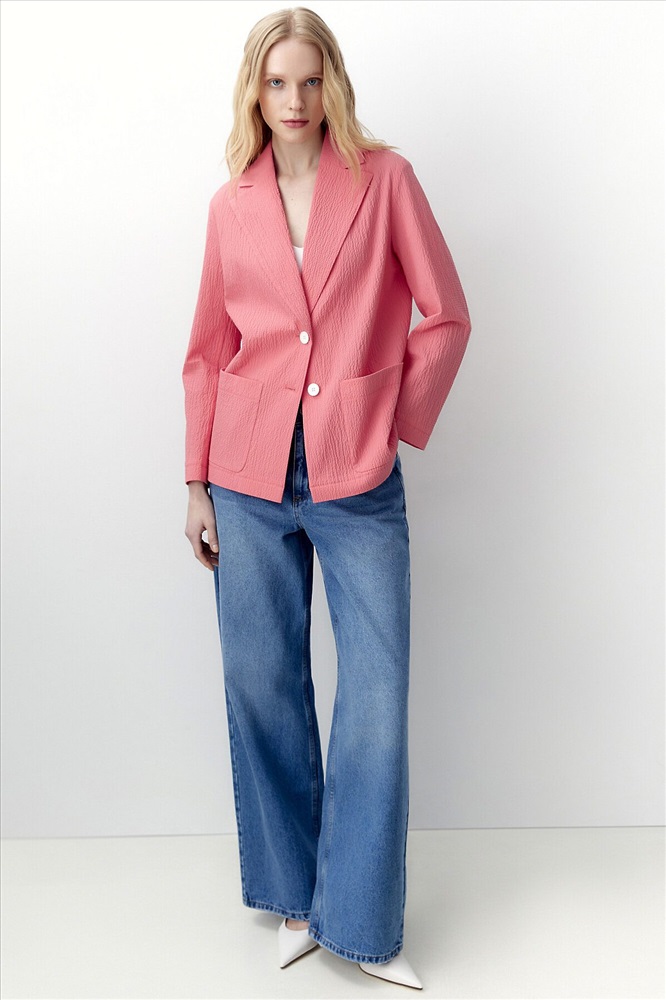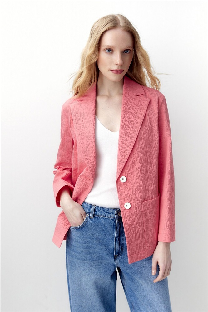 ID товара: 1136699 Состав: Хлопок 99%, Эластан 1% Сезон: Весна/Лето Длина: Средняя Фасон: Прямой Рукав: Длинные Вид застежки: Пуговицы Вырез горловины: V-образный Тип карманов: Накладные Основная ткань: Хлопок Стиль: классический Страна бренда: Россия Страна производства: Россия Прямой однобортный жакет без подкладки из фактурной хлопковой ткани кораллового цвета с английским воротником и V-образным вырезом, рукав классически втачной, на полочке есть накладные карманы. Комментарии к товару
