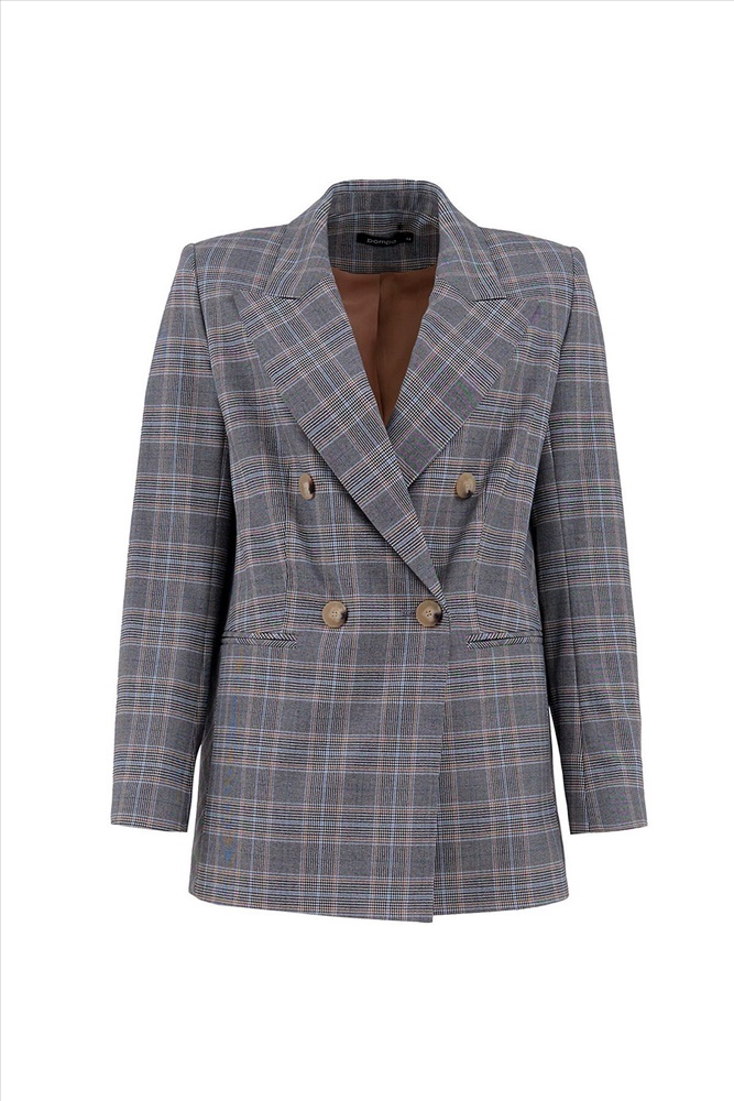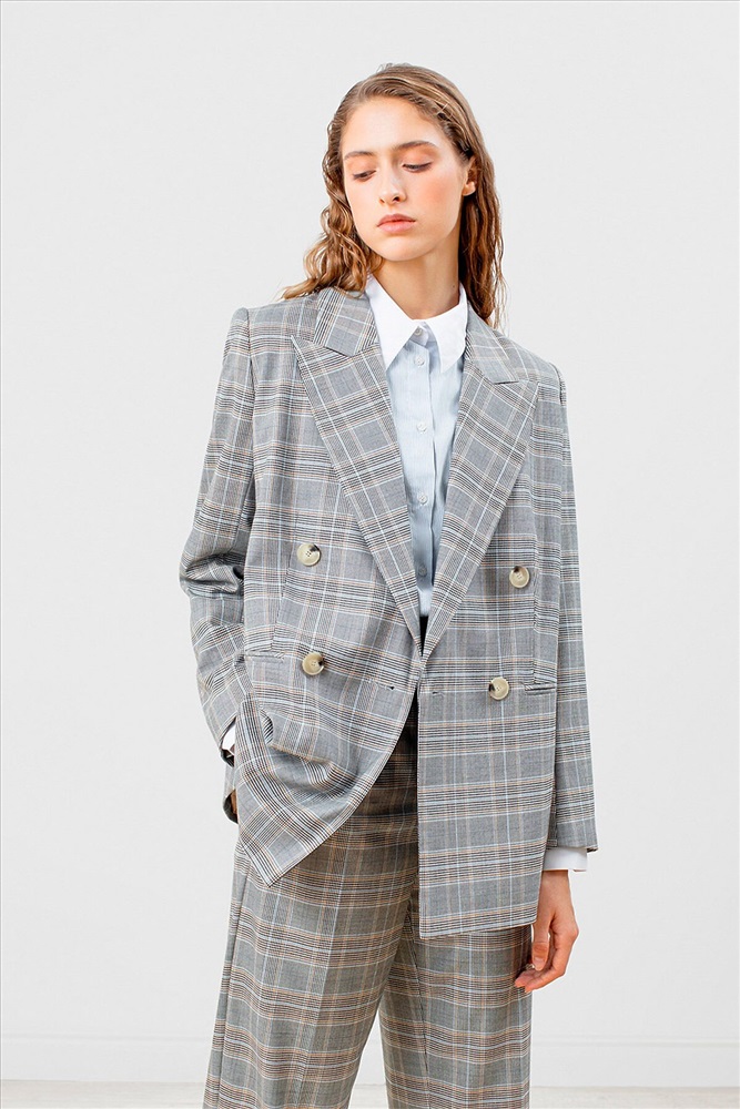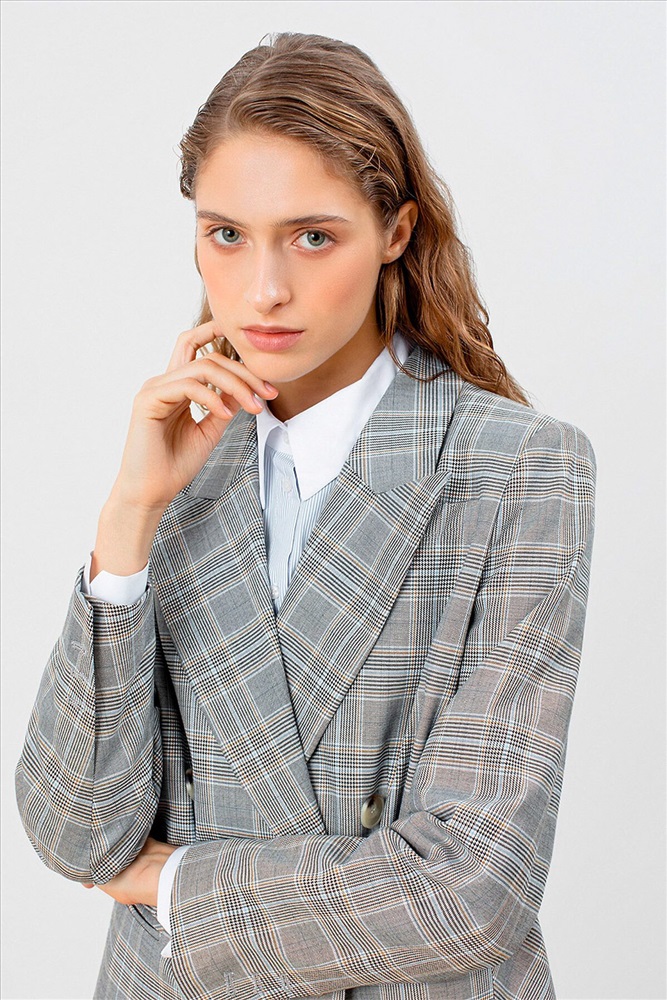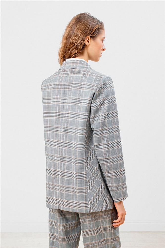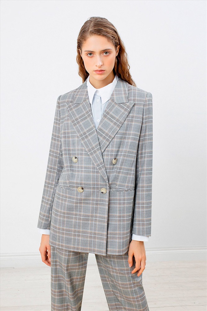 Двубортный жакет на подкладке прямого удлинённого силуэта из серой костюмной ткани в контрастную клетку. Модель имеет v-образный вырез горловины, английский воротник и втачной рукав полной длины. Застежка спереди на два ряда крупных пуговиц. Есть два функциональных прорезных кармана. На спинке расположена шлица для удобства движения.