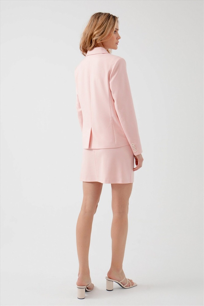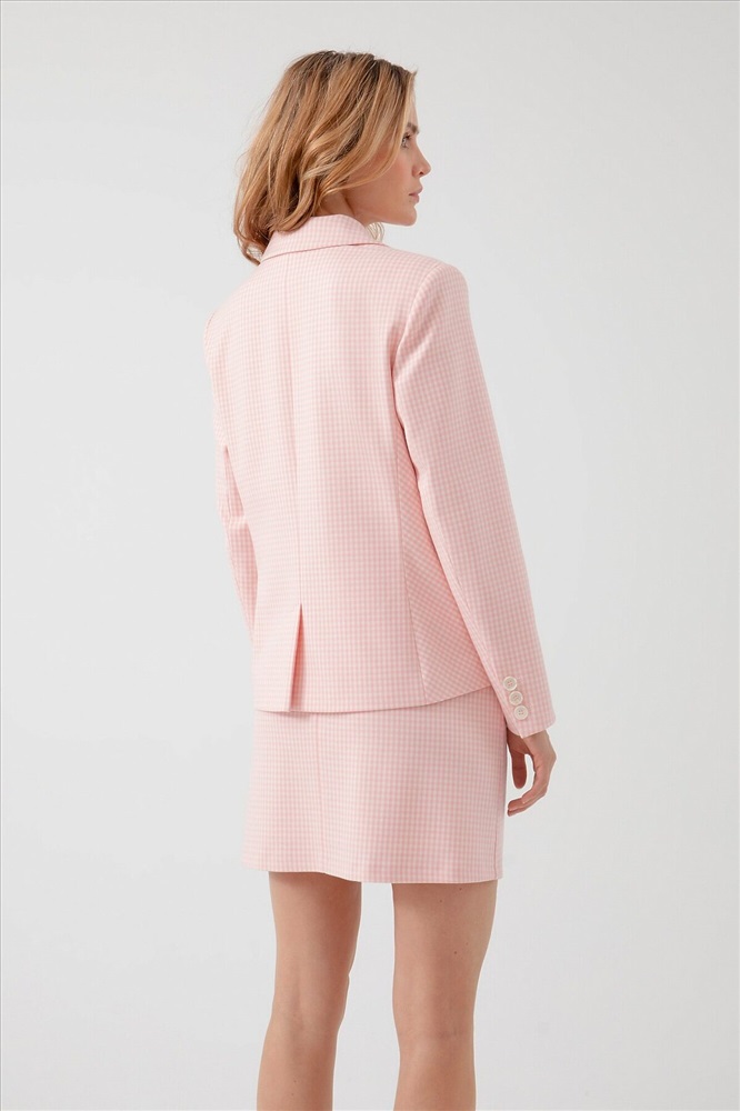 ID товара: 970859 Состав: Полиэстер 63%, Вискоза 34%, Эластан 3% Сезон: Весна/Лето Длина: Средняя Фасон: Приталенный Рукав: длинные Вид застежки: Пуговицы Вырез горловины: V-образный, отложной воротник Рисунок: Клетка Тип карманов: Накладные Основная ткань: Полиэстер Стиль: Деловой стиль Страна бренда: Россия Страна производства: Россия Приталенный однобортный жакет с расширенной линией плеча, завышенной линией лацканов и накладными карманами. Жакет украшают перламутровые пуговицы молочного оттенка. Жакет выполнен из костюмной ткани в розово-молочную клетку, составляет идеальный ансамбль с юбкой из одной ткани. Комментарии к товару