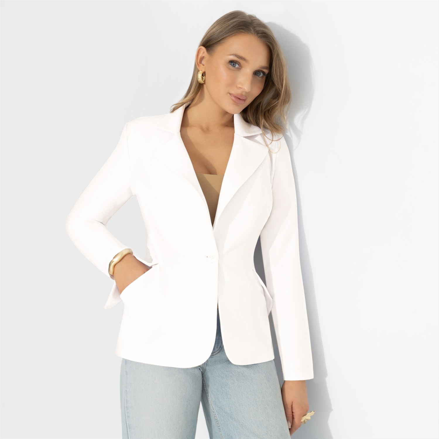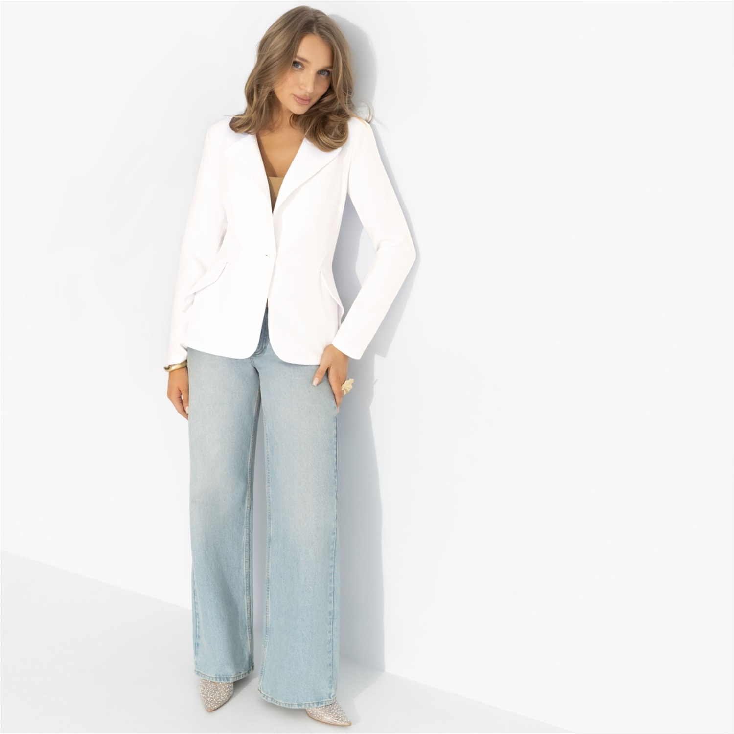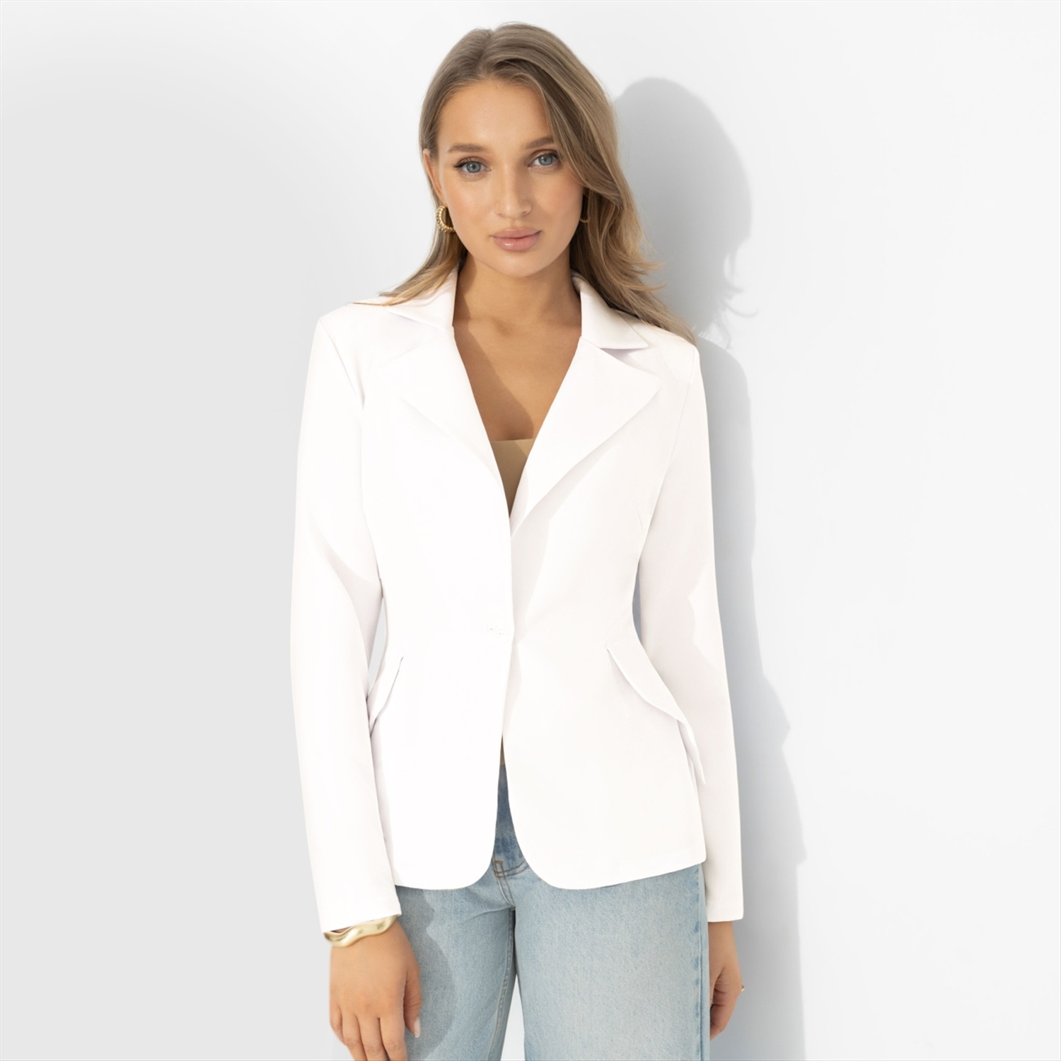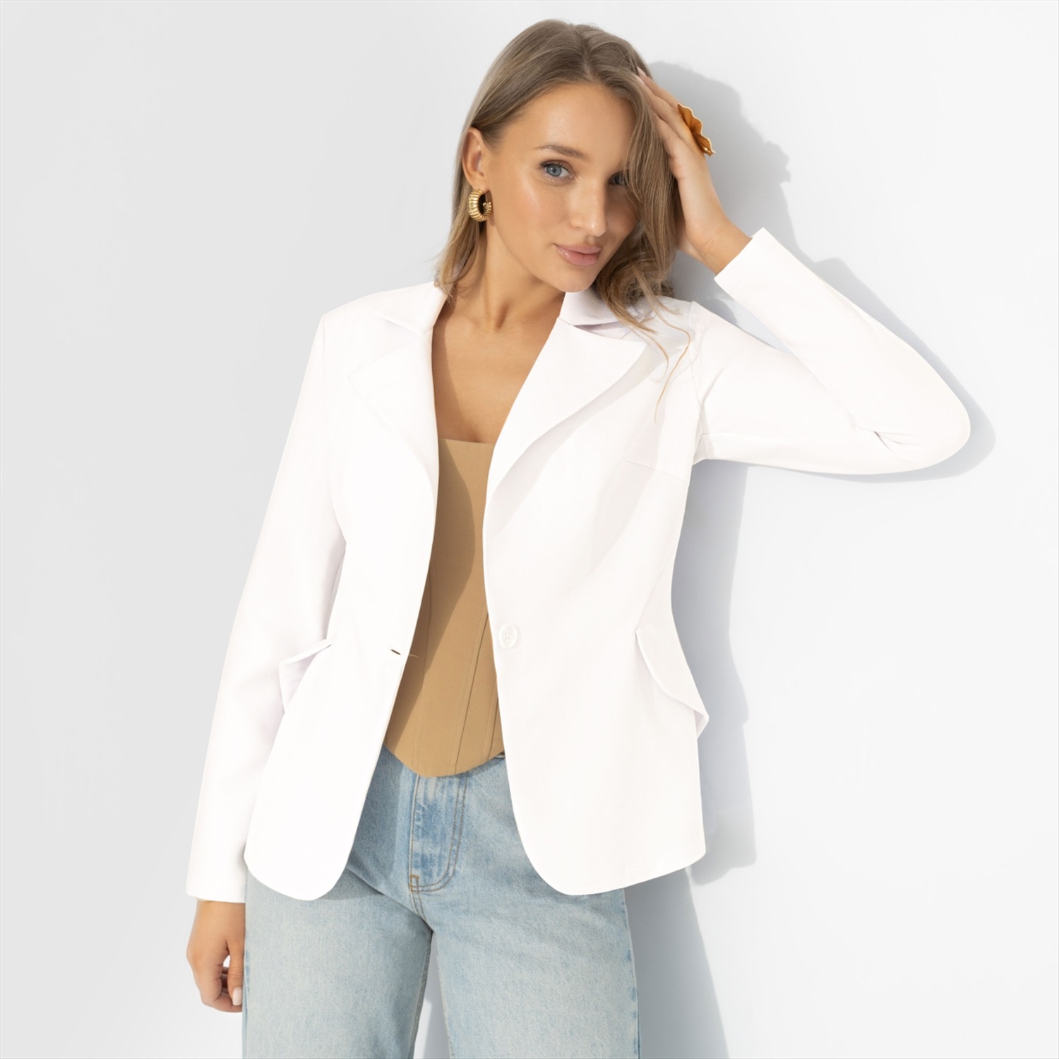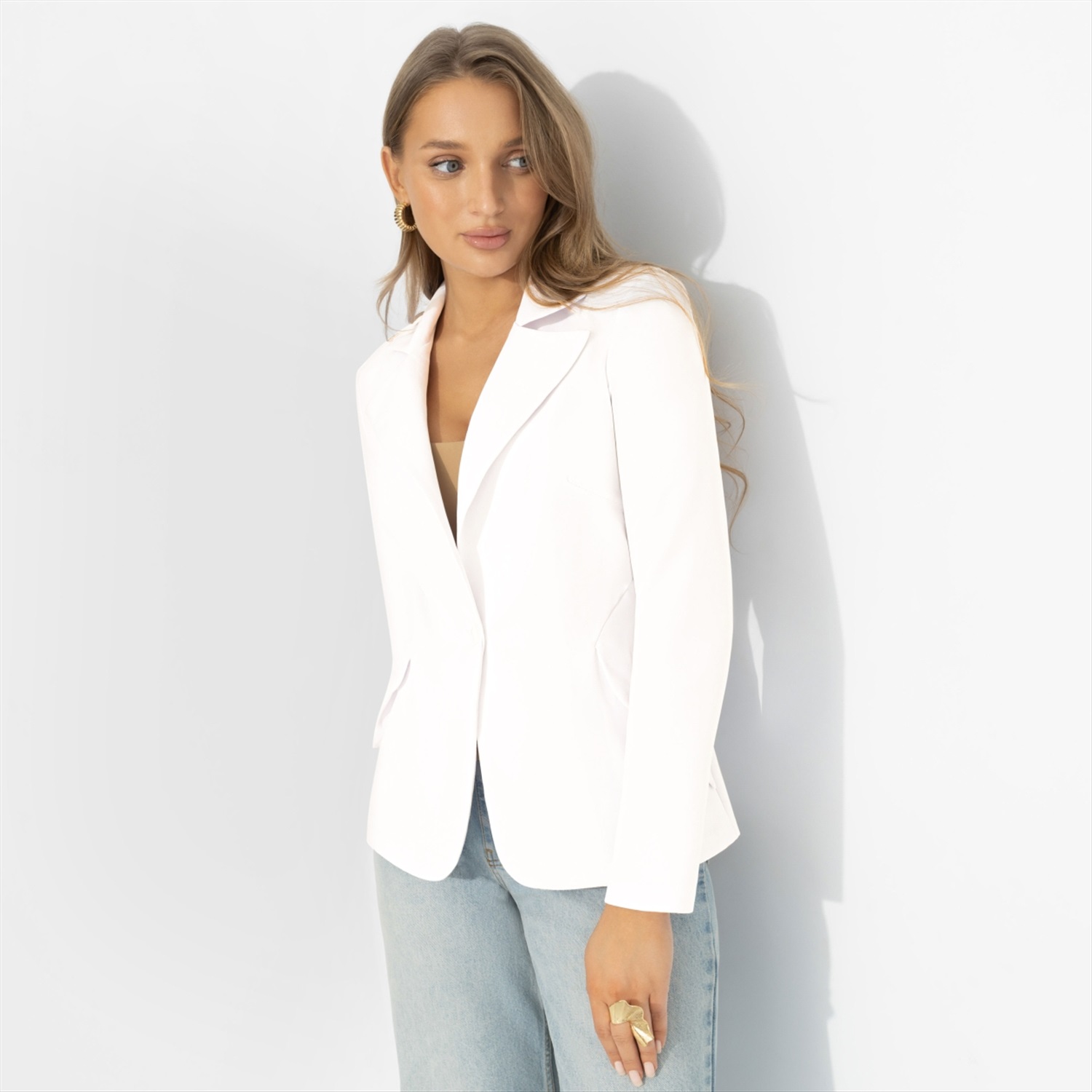 Интересный факт: оттенки белого цвета на подиумах считают самыми сложными – светлый цвет не прощает ошибок и сразу выдает качество кроя. Именно поэтому в тренде сейчас фасоны с идеальной посадкой. Жакет «Шоу-показ» – про тот самый уверенный оттенок белого: чистый, собранный, роскошный без единого элемента декора. Приталенный силуэт жакета подчеркивает фигуру, четкая линия плеч формирует осанку, классические лацканы добавляют статусности образу. Жакет с карманами. Комментарии к товару
