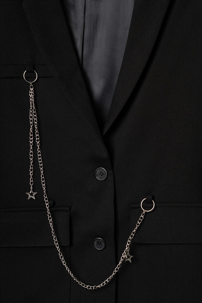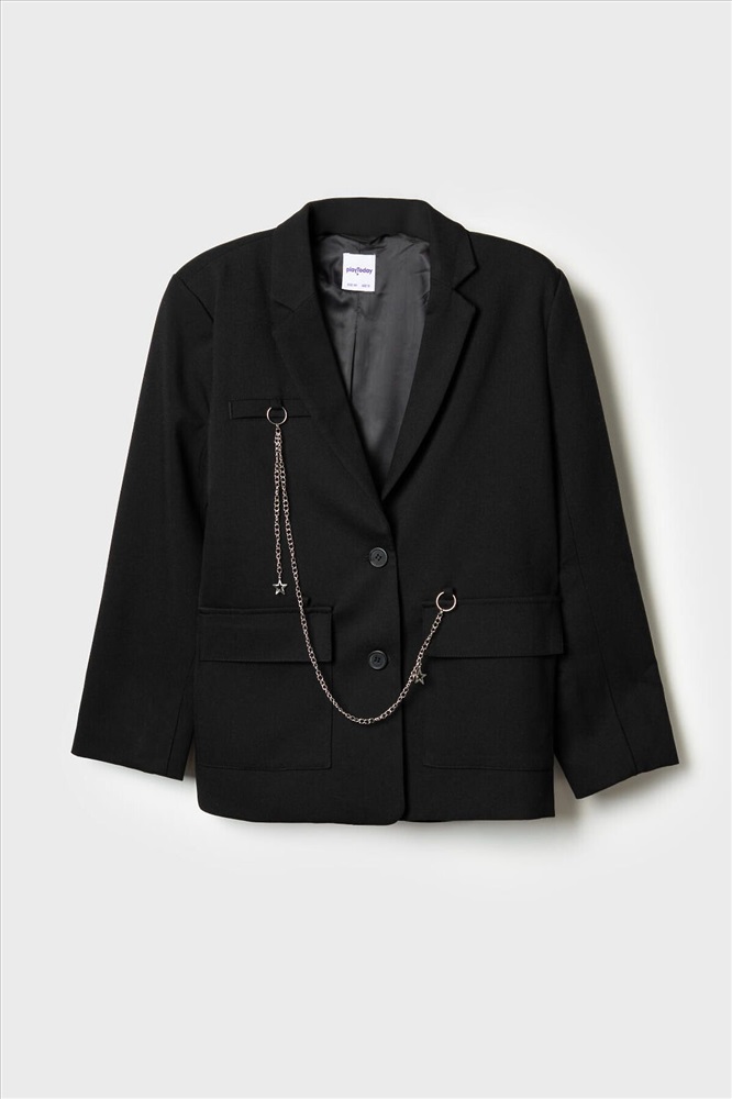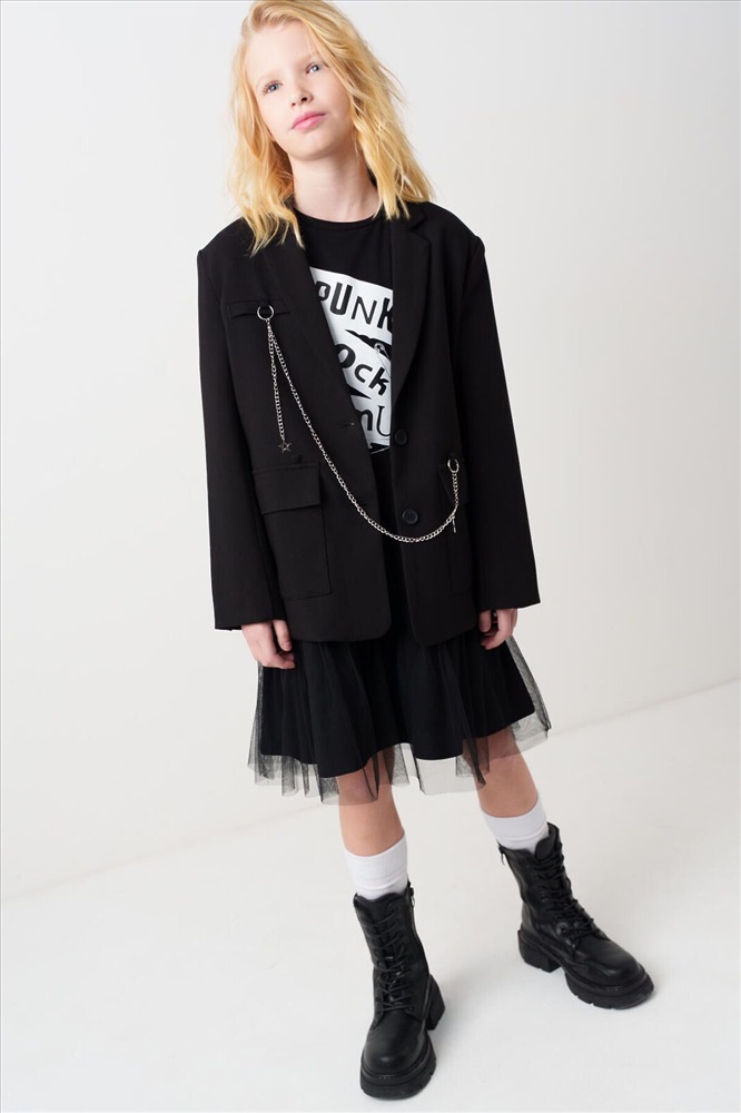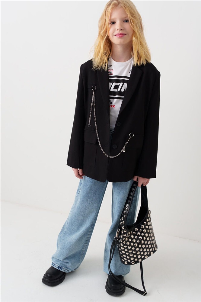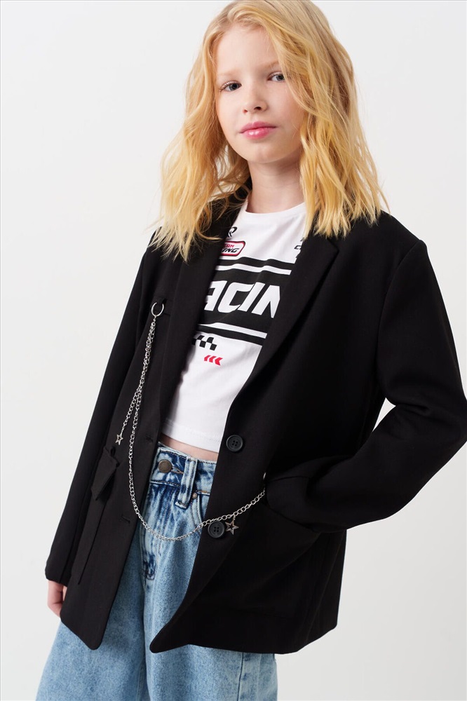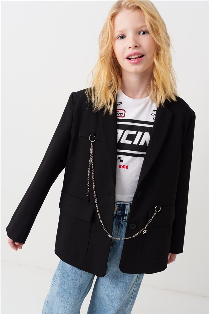 ID товара: 1239616 Состав: 75% полиэстер, 21% вискоза, 4% эластан Сезон: Весна/Лето Пиджак для девочки подростка. Стильный черный жакет прямого силуэта. Застегивается на две пуговицы спереди и дополнен двумя большими карманами. Внутри — гладкая подкладка из таффеты. Главной особенностью дизайна служат декоративные элементы: металлическая цепочка с подвесками и необычные детали в зоне груди — фальш-карман и значок. Комментарии к товару