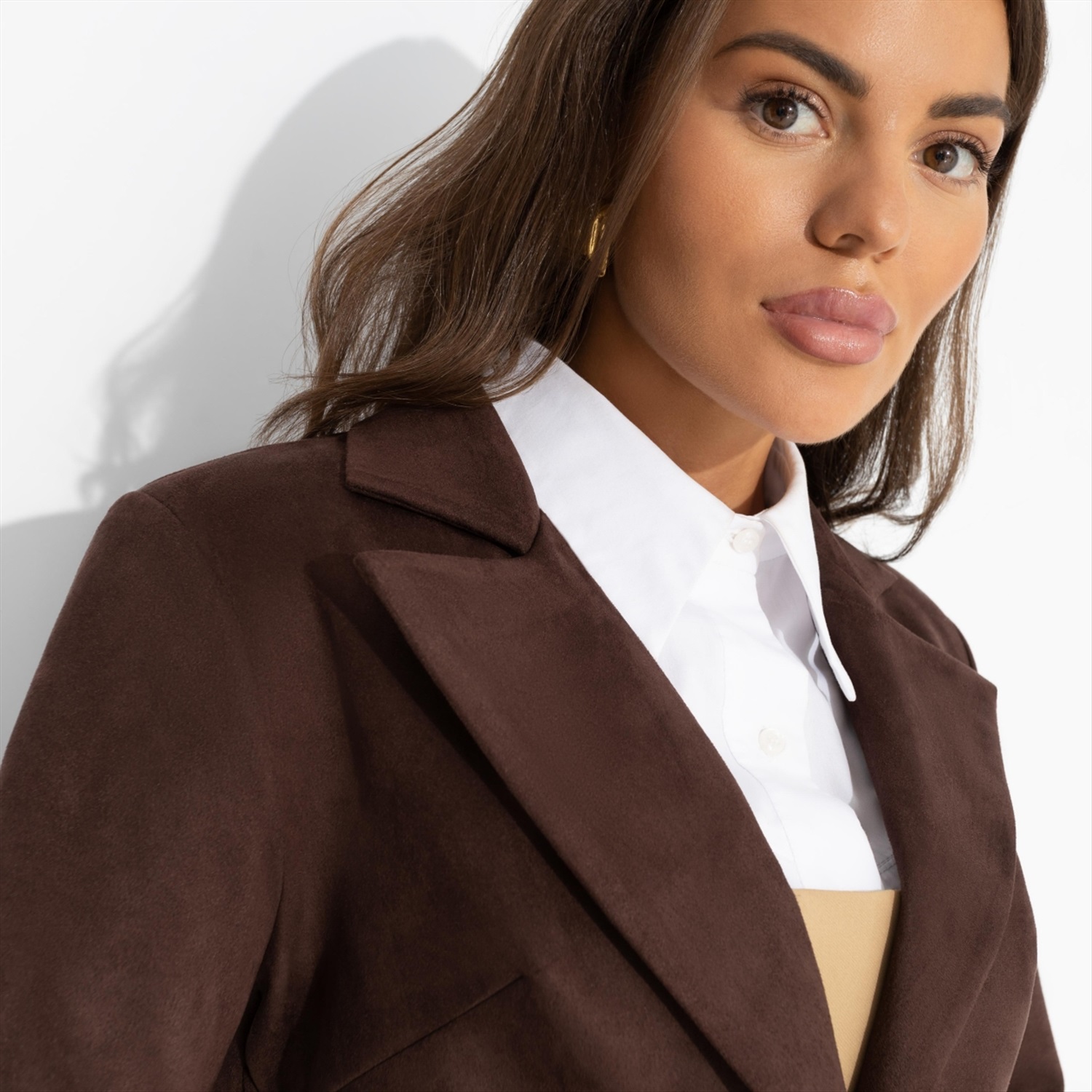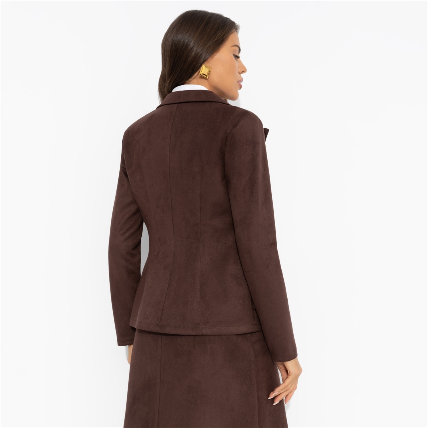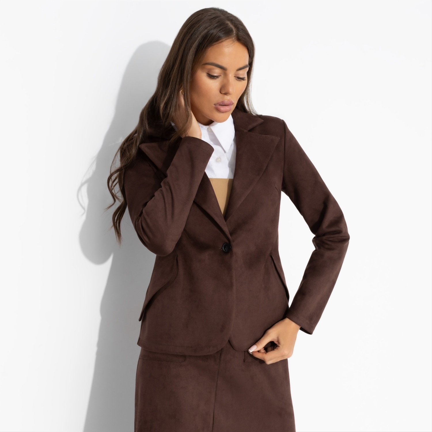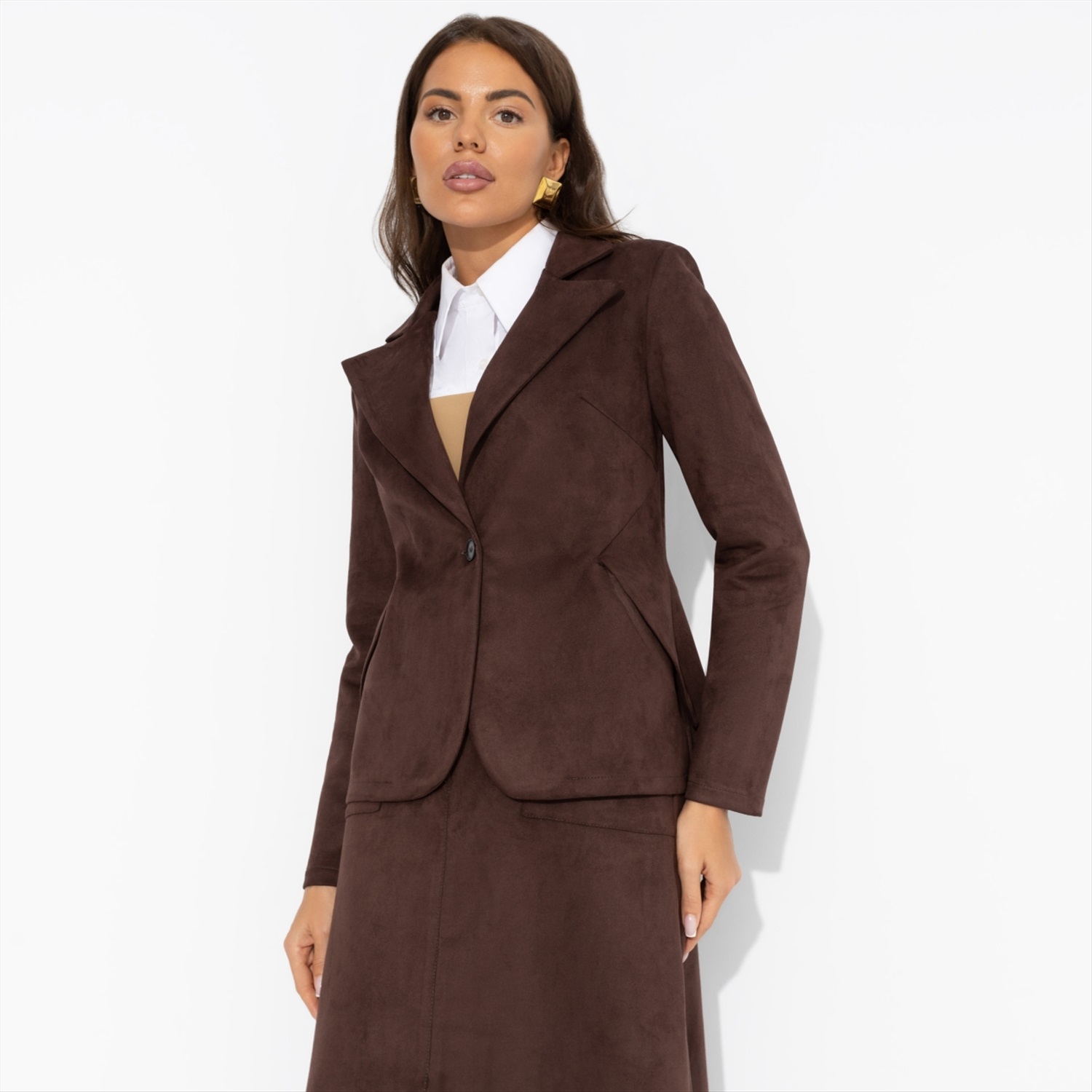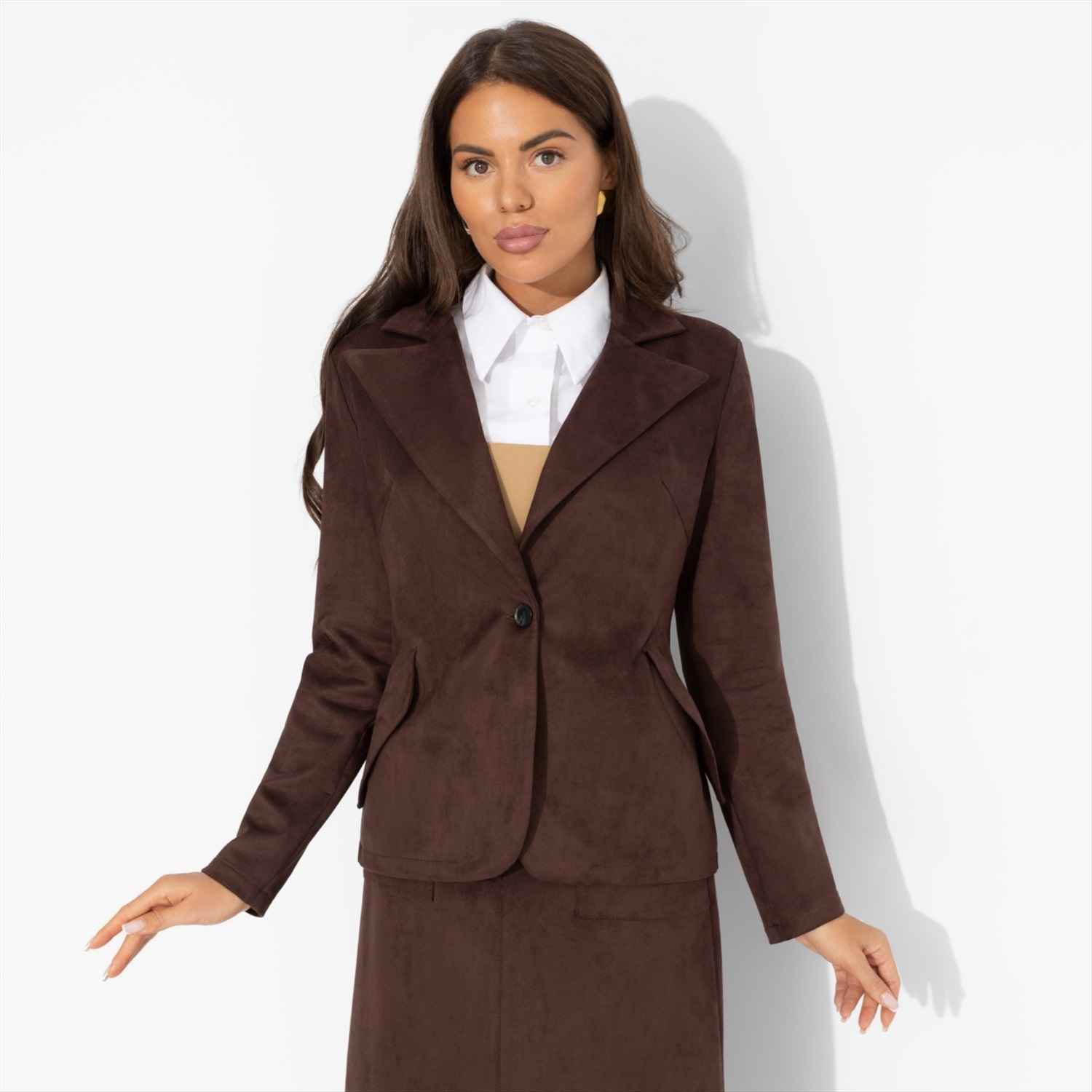 Записывайте рецепт идеального жакета от ЧАРУТТИ: создайте плотную текстуру лекала, взбейте до бархатистой нежности. Используйте нужный цвет: возьмите густую массу горького какао. Мягкие линии лацканов и округлые пуговицы, словно частицы шоколада, добавляют пикантной изысканности. Жакет должен обволакивать силуэт, оставляя сладкое послевкусие. Жакет полуприталенного силуэта с лацканами. Изделие застегивается на пуговицу. Жакет с карманами на подплечниках.