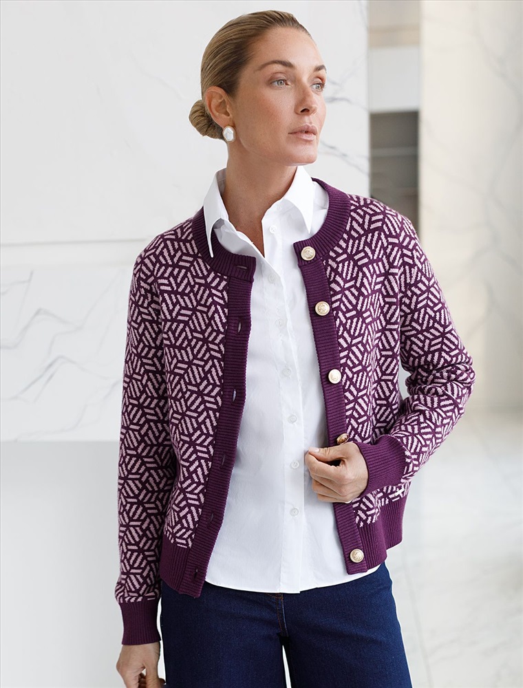 Жакет жаккардовой вязки выполнен из нежной пряжи на основе вискозы с добавлением кашемира. Модель с круглым вырезом и золотистой фурнитурой выглядит дорого и роскошно, приятно ощущается на теле и поддерживает комфортный микроклимат. Совет стилиста: сочетайте с однотонными брюками, юбкой, платьем или джинсами. Можно использовать в комплекте total-look с D39.362 и с платьем D32.110