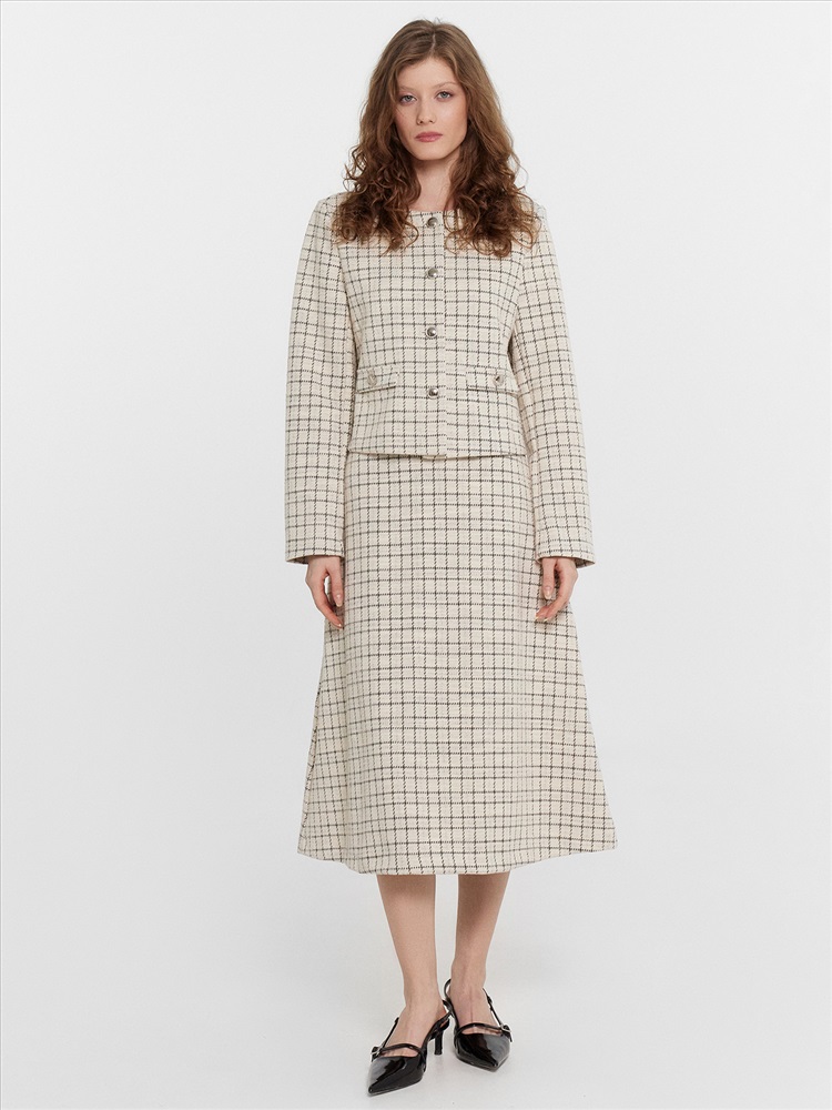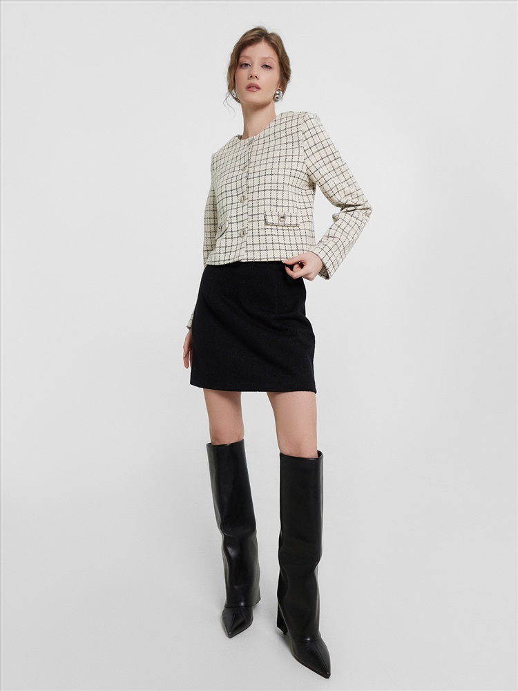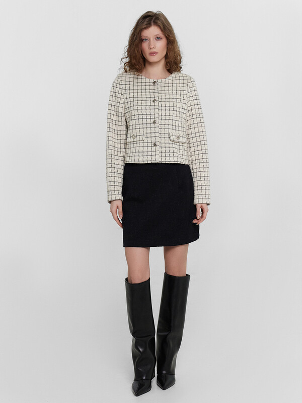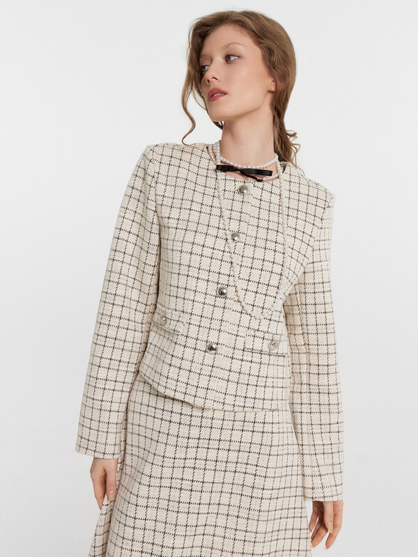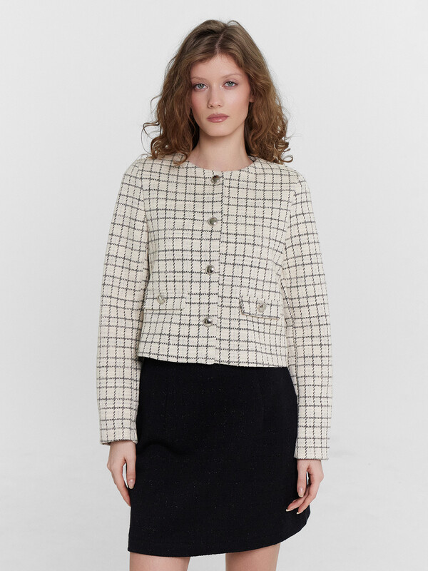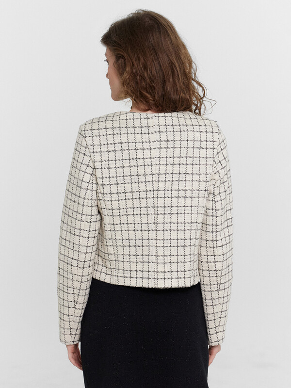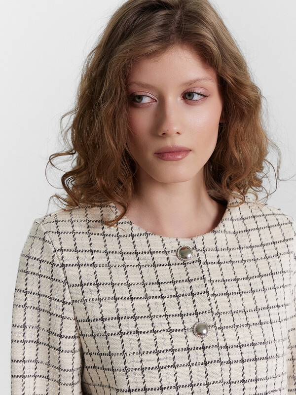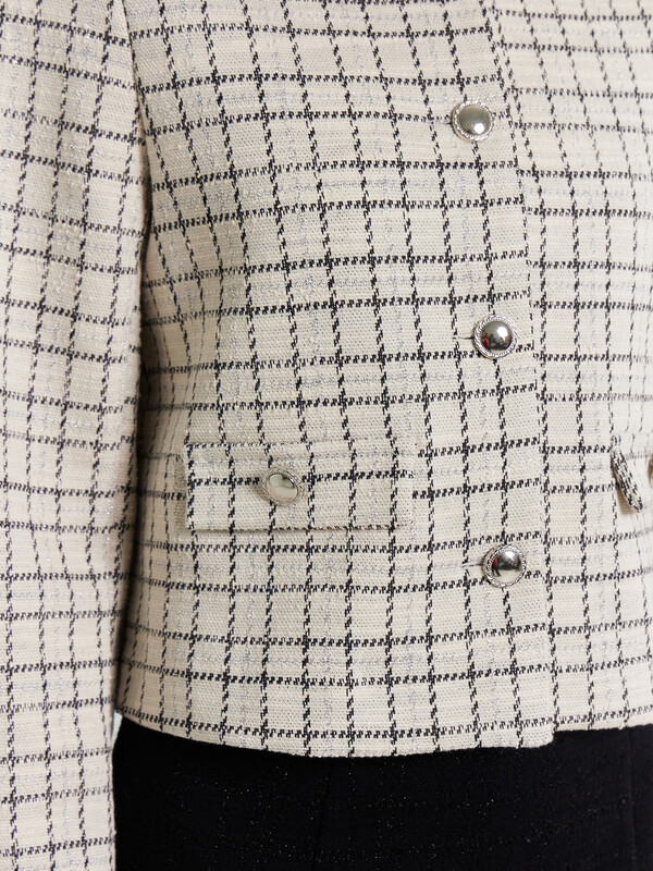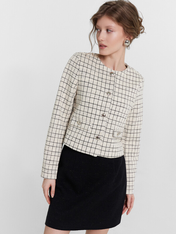 Этот укороченный женский жакет прямого силуэта станет стильным дополнением вашего гардероба. Горловина круглой формы и длинные рукава придают жакету элегантный вид. Застежка на петли и пуговицы обеспечивает удобство, а спереди располагаются клапаны с пуговицами, добавляя изделию изысканности. Для его выполнения использовали материал академик с добавлением люрекса, который придает характерный легкий блеск. Этот жакет идеально подойдет для создания стильных образов, добавляя в ваш наряд нотку изящества и шика.