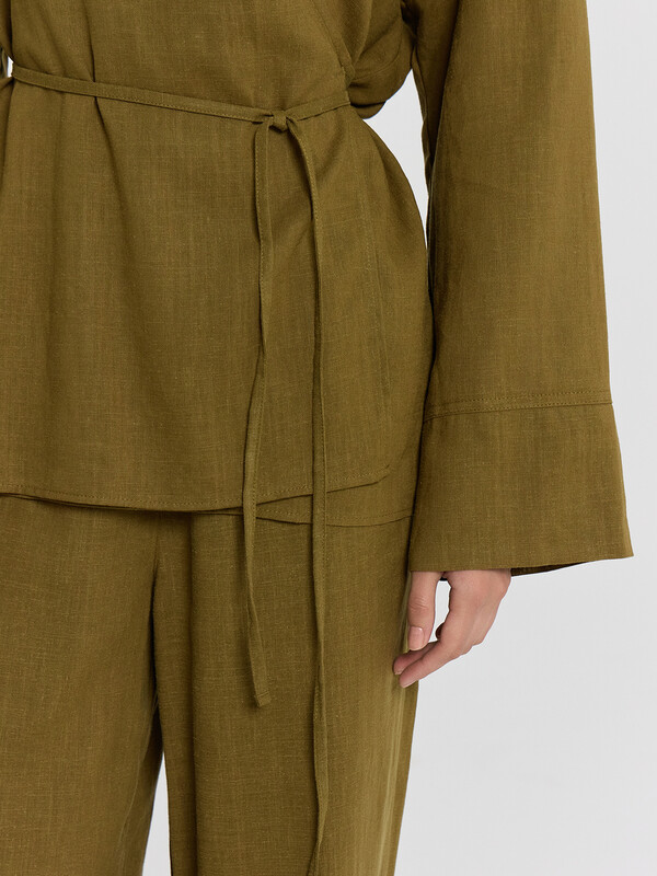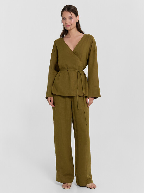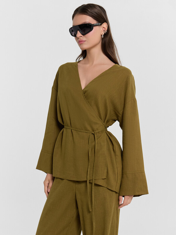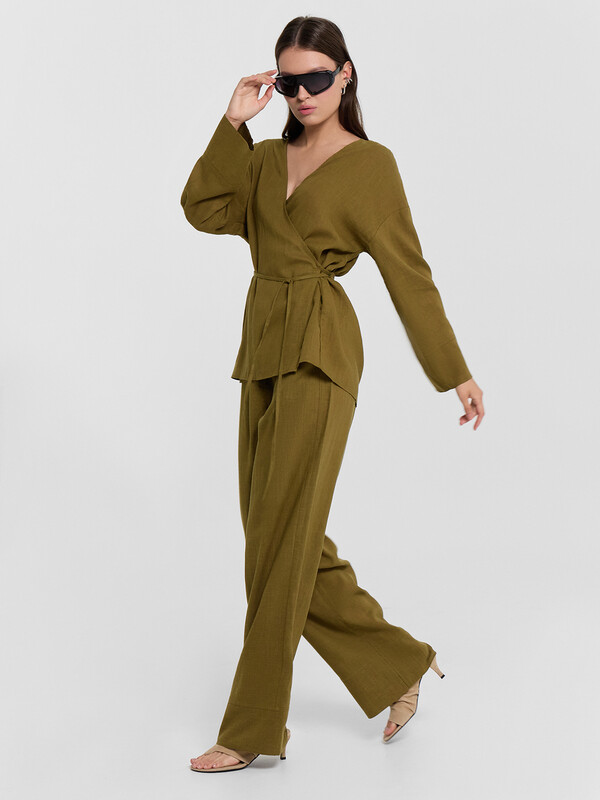 Женский жакет свободного кроя — сочетание комфорта и элегантности. Длинные рукава с широкими манжетами добавляют выразительности, а спущенное плечо создает расслабленный силуэт. Застежка на запах с завязками подчеркивает женственность, а V-образный вырез делает образ утонченным. Материалы — рами и лиоцелл — обеспечивают легкость, воздухопроницаемость и приятные тактильные ощущения. Они устойчивы к износу, хорошо держат форму и дарят комфорт в течение всего дня. Дополните этот жакет подходящими брюками из коллекции Mark Formelle, чтобы создать гармоничный и стильный комплект.