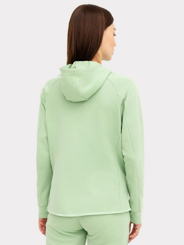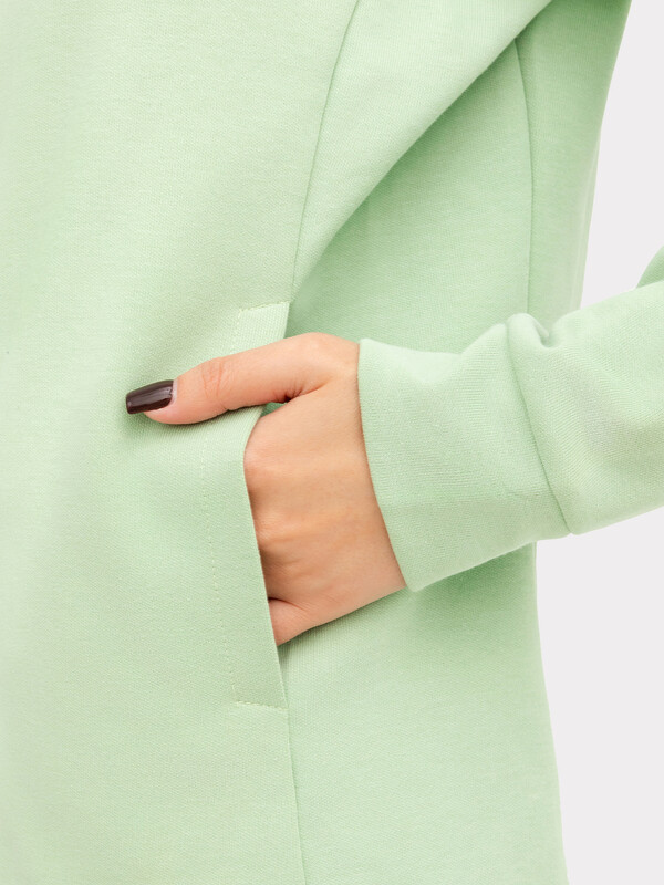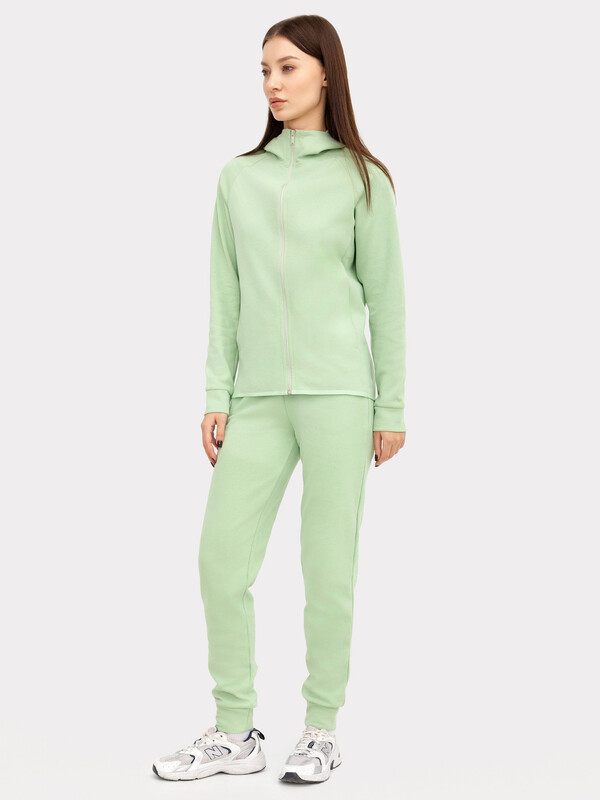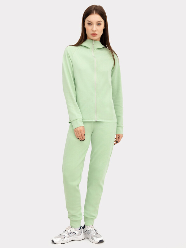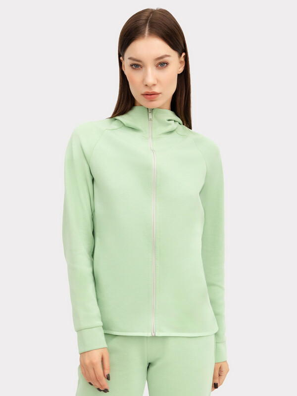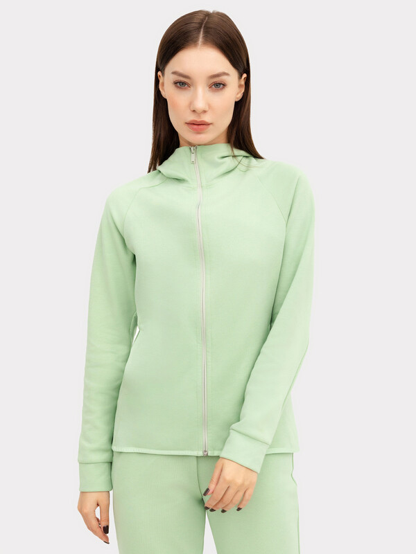 Жакет женский выполнен из трикотажного полотна. Жакет прямой свободный с отрезными бочками. Капюшон 2-х шовный с отрезной обтачкой. Шов втачивания капюшона закрыт тесьмой хб. Рукава реглан 2х шовные с локтевым швом, на манжете из основного полотна.