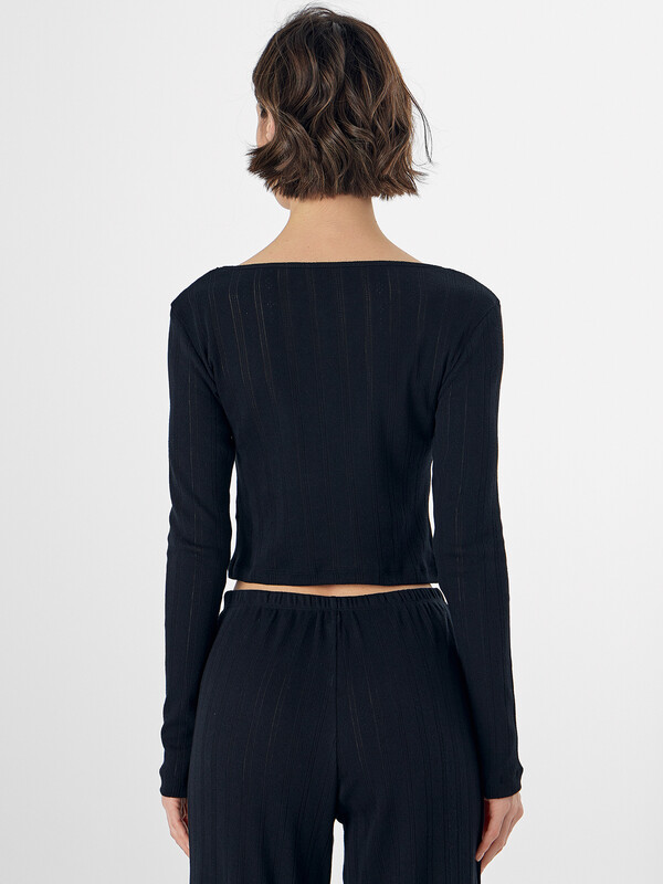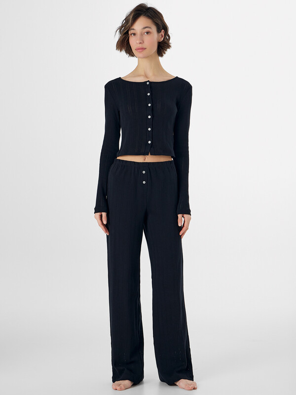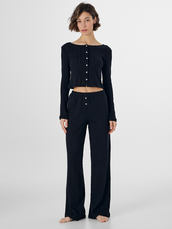 Укороченный домашний жакет — это уютная и женственная вещь для расслабленных дней. Он выполнен из мягкой хлопковой рибаны, которая обеспечивает комфорт, хорошо тянется и приятно облегает фигуру.