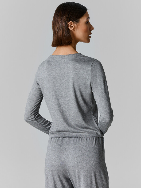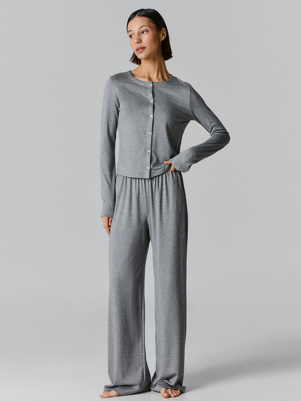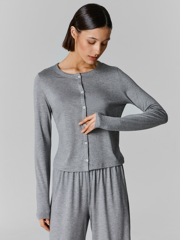 Женский домашний кардиган прилегающего силуэта из эластичной вискозы — это элегантная и универсальная модель, которая подчеркивает фигуру и дарит ощущение уюта. Округлая горловина придает образу мягкость, а длинные рукава делают кардиган подходящим для любого времени года. Центральная застежка на пуговицы с петлями добавляет классический акцент и позволяет регулировать степень открытости. Низ изделия и рукавов аккуратно обработан швом вподгибку, что придаёт модели завершенный и опрятный вид. Эластичная вискоза в составе обеспечивает мягкость, отличную посадку и приятные тактильные ощущения, а также позволяет изделию сохранять форму даже после многократных стирок. Для создания стильного и гармоничного домашнего образа рекомендуем дополнить кардиган подходящими брюками из коллекции бренда. Такой комплект станет отличным выбором для отдыха дома, уютных вечеров или расслабленных выходных.