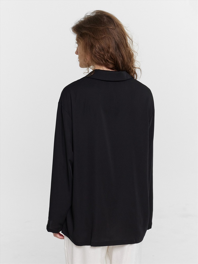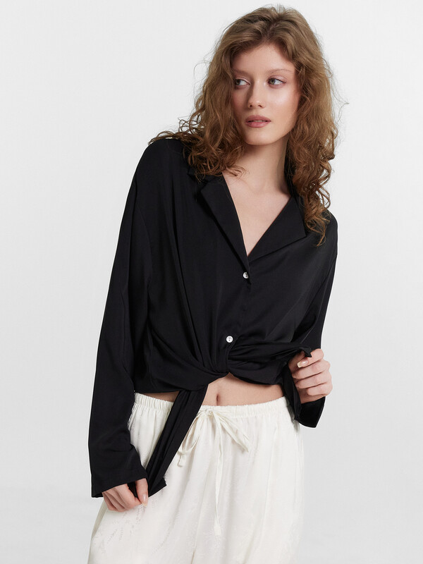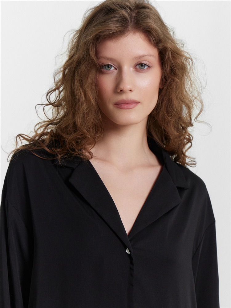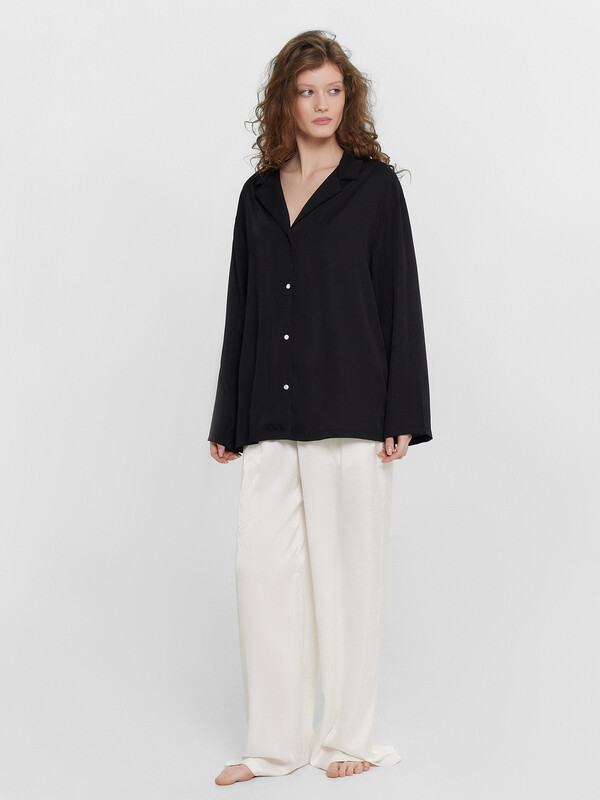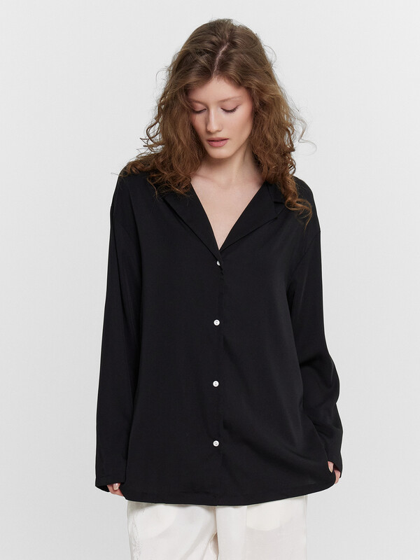 Силуэт прямой и свободный, рукава длинные втачные, линия плеча немного спущена. Центральная застежка на пуговицы, воротник отложной. Низ изделия и низ рукавов застрочен швом в подгибку.