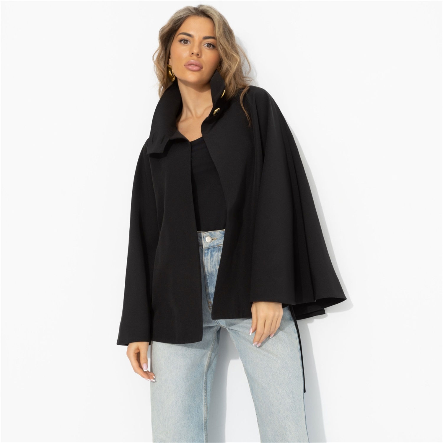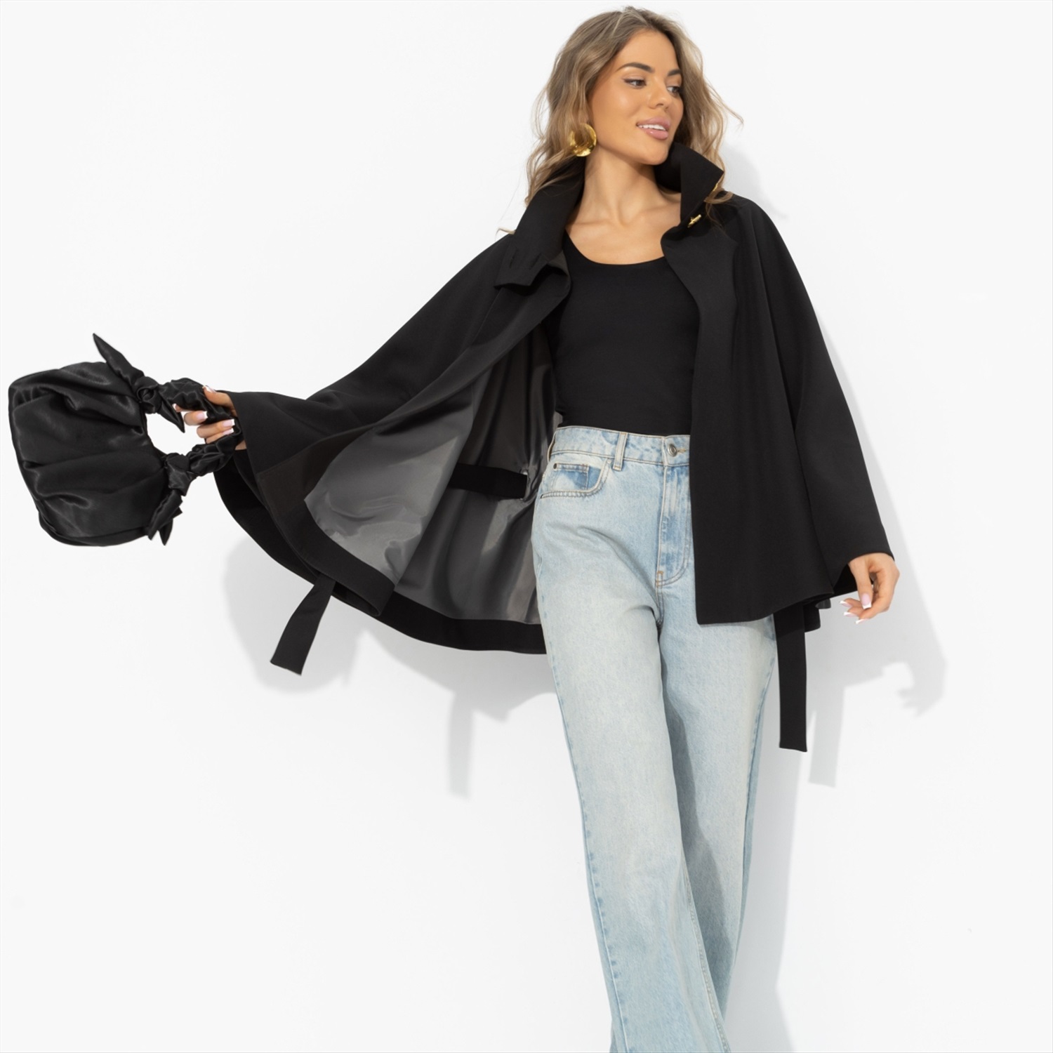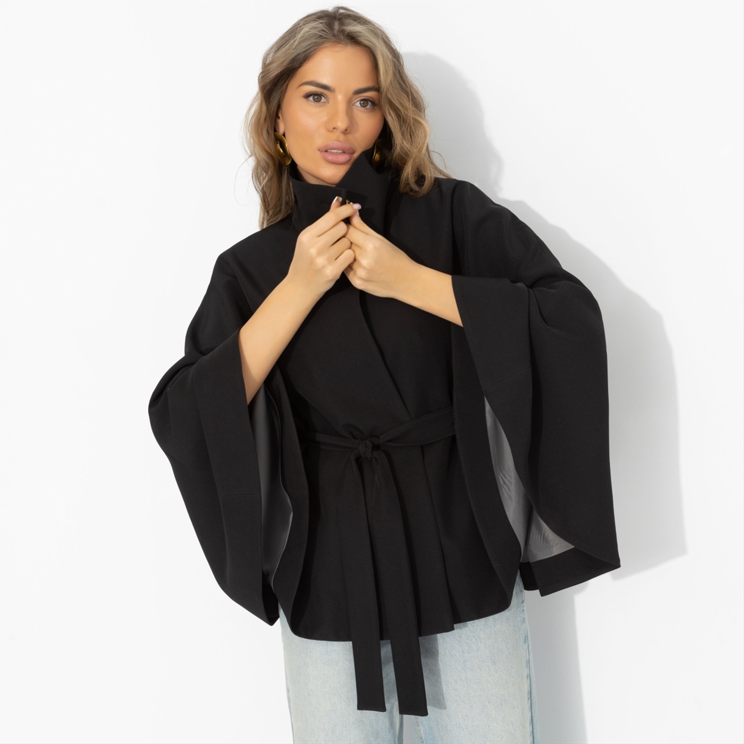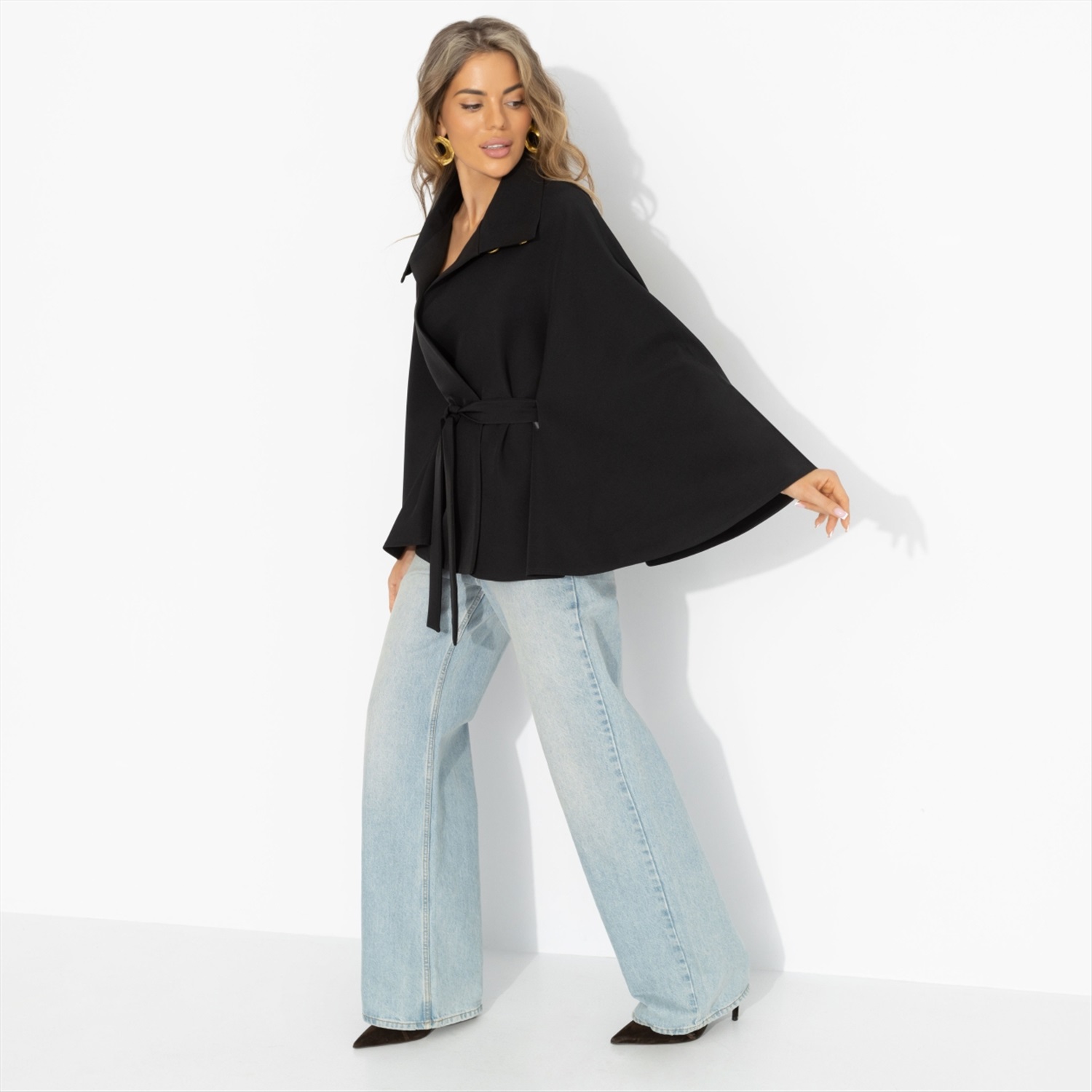 Почему ночью вещи звучат иначе? Потому что в темноте остаётся только главное. Этот жакет – как сцена в Нью-Йорке после дождя: чёрный, текучий, с размахом рукавов, которые ловят воздух при каждом шаге. Он ложится на плечи как кейп и создаёт ощущение власти над пространством. Можно носить как верхнюю одежду, вместо ветровки или лёгкого плаща сезон. Пояс собирает силуэт или остаётся свободным. Лучше всего работает с денимом, платьями, каблуками при вечернем свете города. Изделие с высоким воротником-стойкой, на подкладе. Комментарии к товару