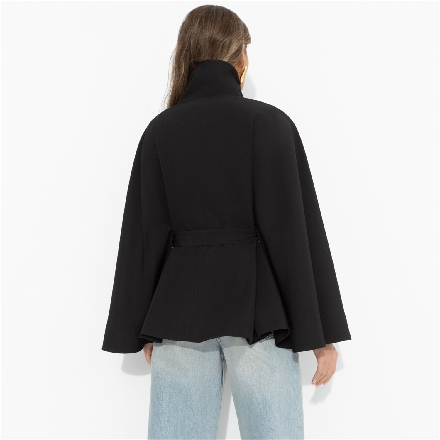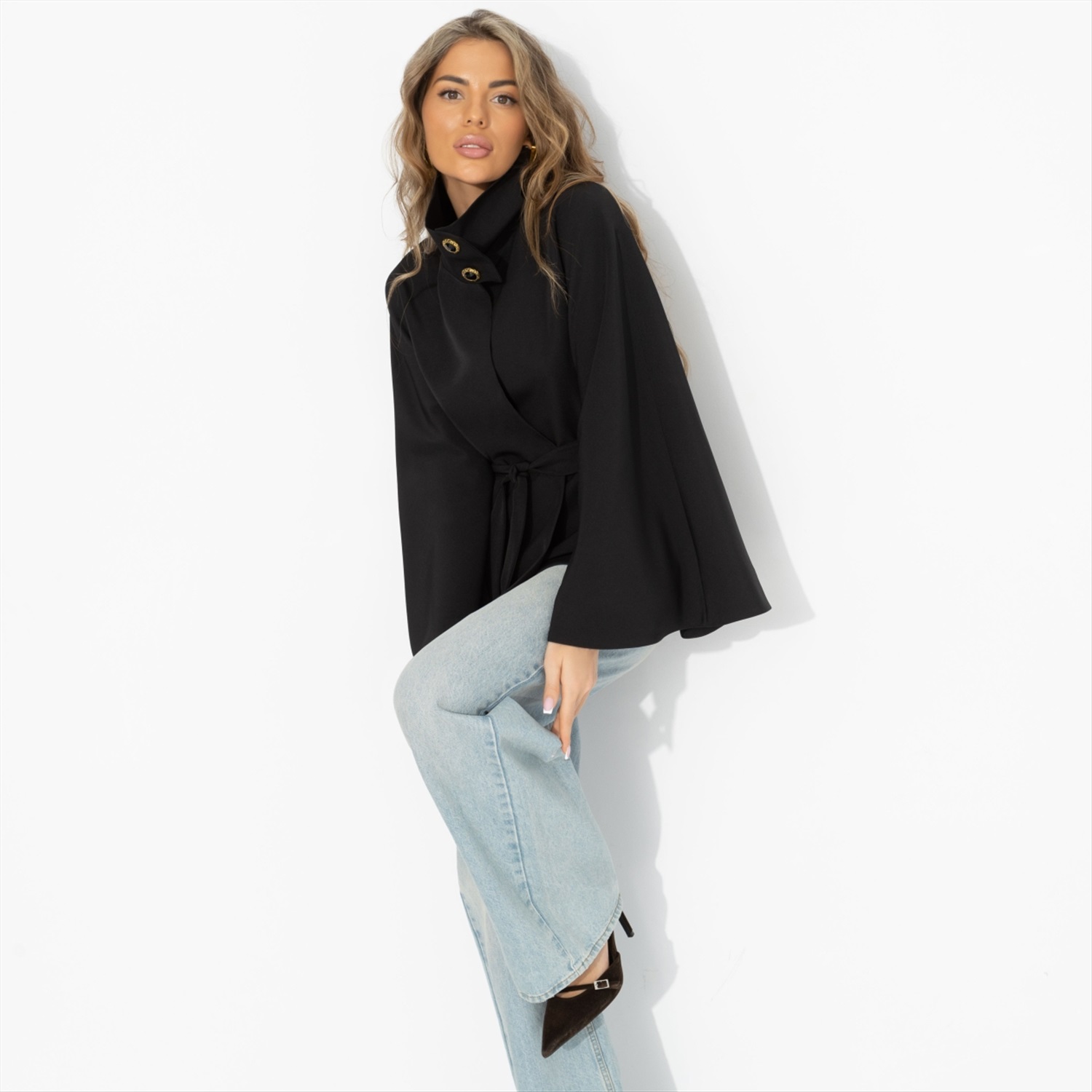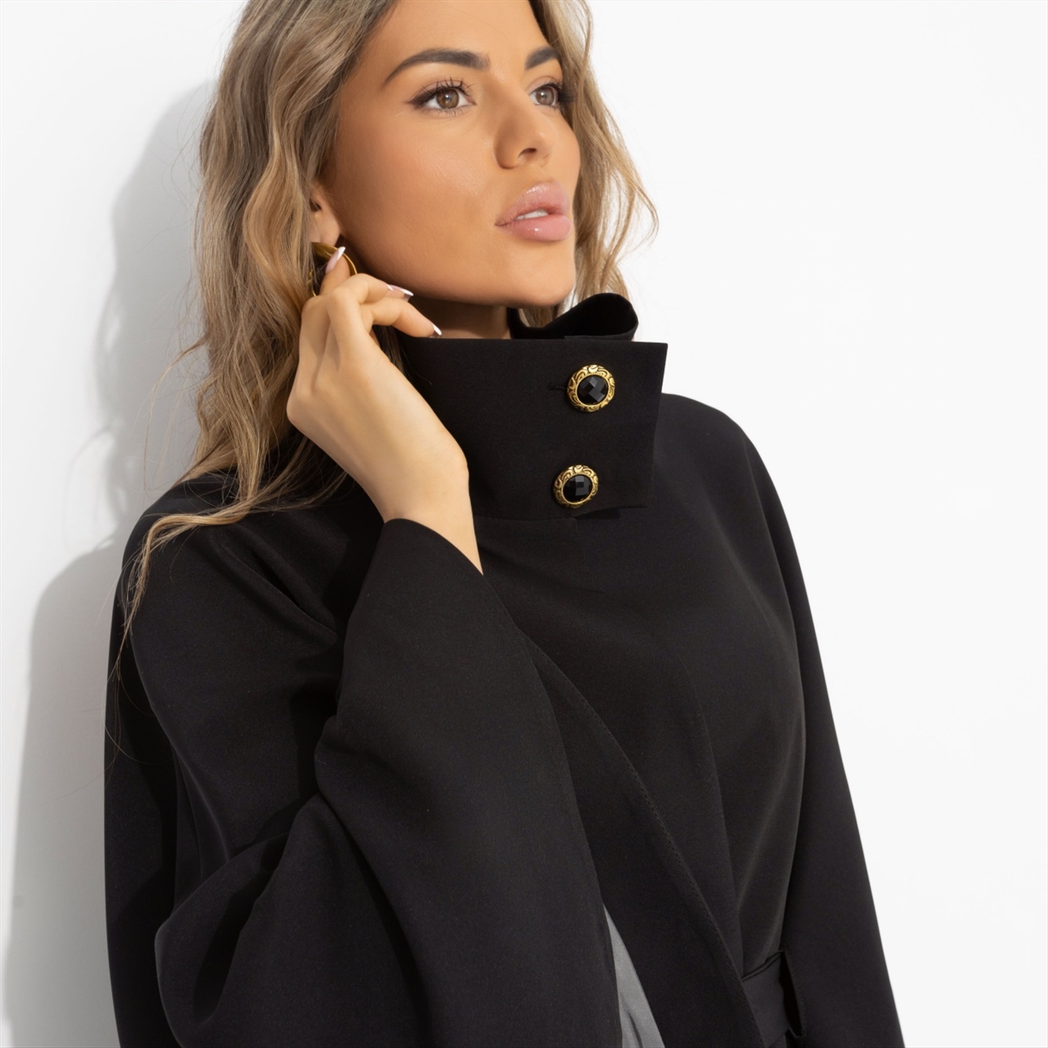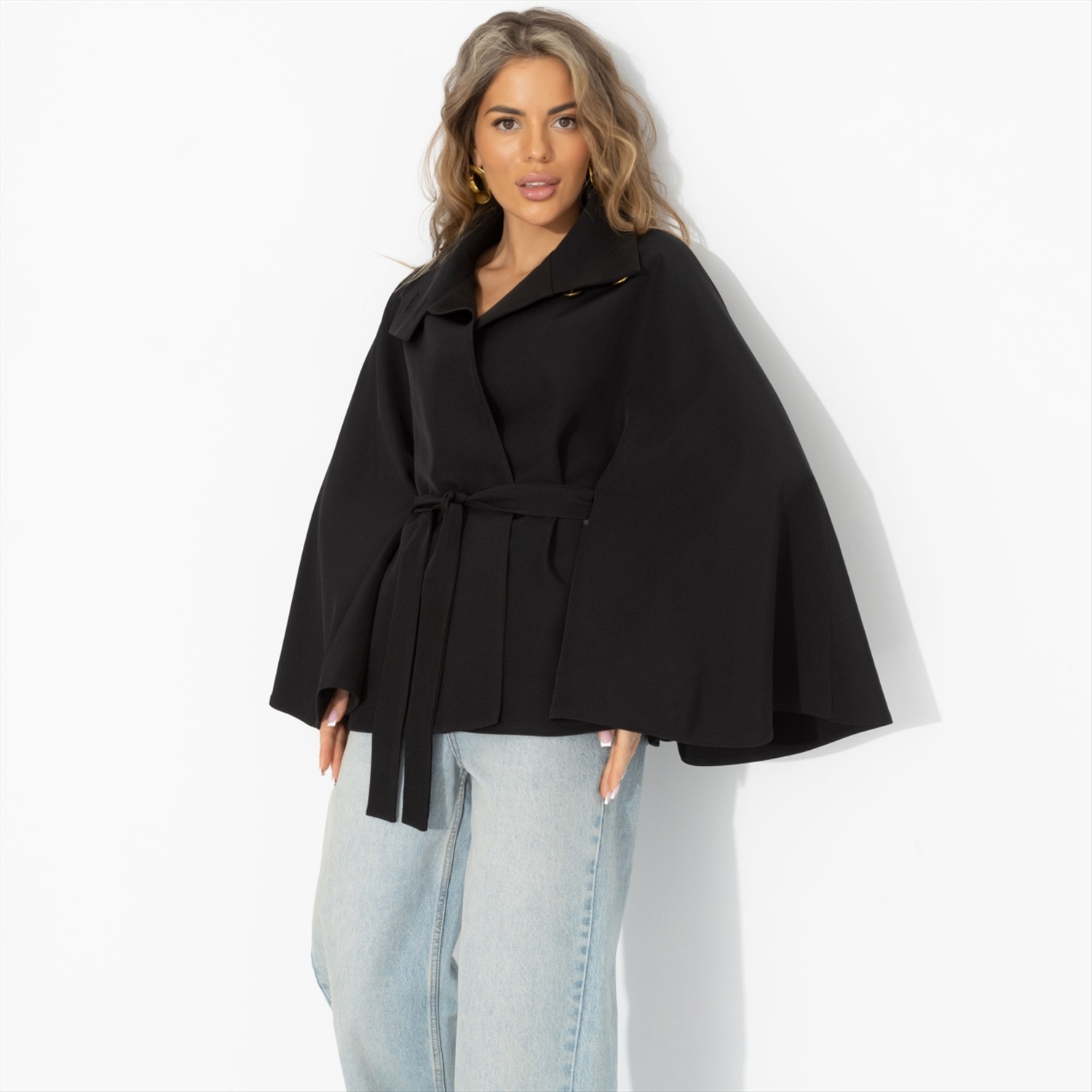 Почему ночью вещи звучат иначе? Потому что в темноте остаётся только главное. Этот жакет – как сцена в Нью-Йорке после дождя: чёрный, текучий, с размахом рукавов, которые ловят воздух при каждом шаге. Он ложится на плечи как кейп и создаёт ощущение власти над пространством. Можно носить как верхнюю одежду, вместо ветровки или лёгкого плаща сезон. Пояс собирает силуэт или остаётся свободным. Лучше всего работает с денимом, платьями, каблуками при вечернем свете города. Изделие с высоким воротником-стойкой, на подкладе. Комментарии к товару