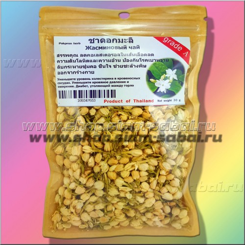 В упаковке 30 грамм крупных цельных засушенных цветков жасмина, произведено в Таиланде.