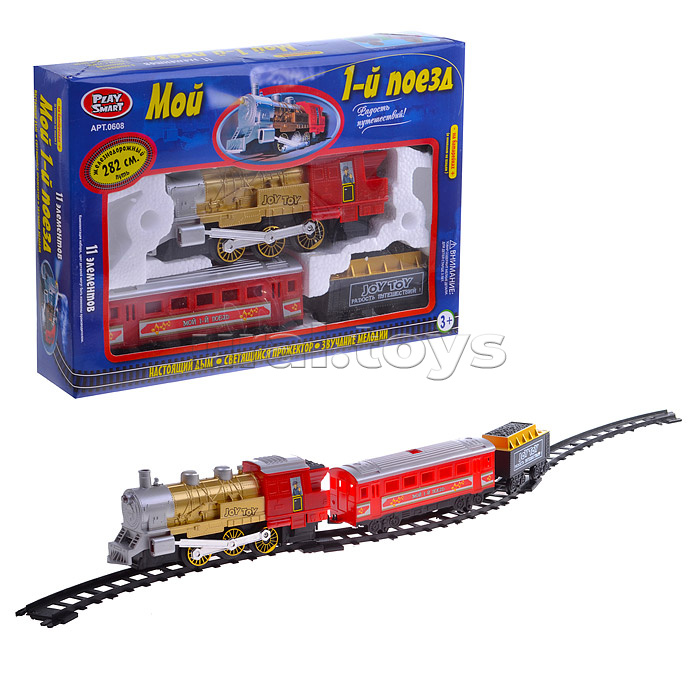 В комплекте: локомотив, два вагона и восемь участков пути. Локомотив движется вперед, горит фонарь, из трубы идет дым. Движение локомотива работает от 2-х батареек R20 (не входят в комплект). Свет и дым работают от 2-х батареек ААА (не входят в комплект). Размеры локомотива: 24 х 6 х 10 см. Протяженность пути: 282 см. Ширина колеи: 3,2 см. Материал: пластмасса. Соответствует требованиям безопасности продукции. Для детей от 3-х лет.