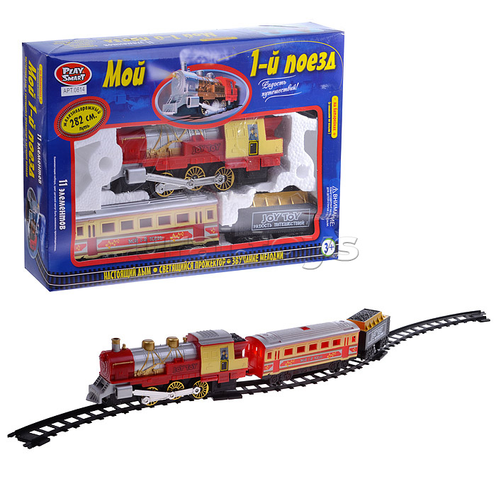 Код: 021016 Страна производитель: Китай Размеры упаковки: 7 x 38 x 26 см Количество в коробке: 24 Локомотив движется вперед, выпускает из трубы дым, воспроизводит звуки поезда, подсвечивается прожектор Для работы поезда нужны 2 батарейки "ААА" и 2 батарейки "LR20" (не входят в комплект). Размеры локомотива: 24 х 6 х 9,5 см. Длина пути: 282 см. Ширина колеи: 32 мм. Материал: пластмасса. Соответствует требованиям безопасности продукции. Для детей от 3-х лет. Комментарии к товару
