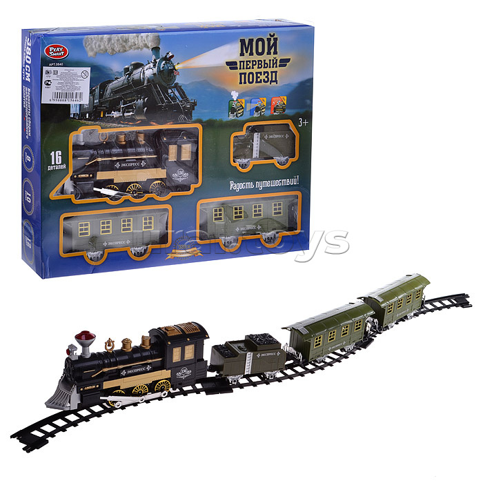 Код: 076181 Страна производитель: Китай Размеры упаковки: 7 x 44 x 34 см Количество в коробке: 12 • В комплекте 16 деталей: • локомотив (25.5 см.) - 1 шт. • вагон с углём (13.5 см.) - 1 шт. • вагон пассажирский (20 см.) - 2 шт. • рельсы прямые - 2 шт. • рельсы изогнутые - 8 шт. • Функции локомотива: - движение вперёд, - светящийся прожектор, - реалистичные звуки поезда, - дым, как у настоящего паровоза. • Общая длина железнодорожного пути: 380 см. • Ширина колеи: 3.2 см. • Установите 2 батарейки R20 в верхний отсек локомотива и 2 батарейки R3/AAA в нижний отсек. • Батарейки в комплект не входят. • Материал: пластмасса. • Соответствует требованиям безопасности продукции. • Для детей от 3-х лет. Комментарии к товару