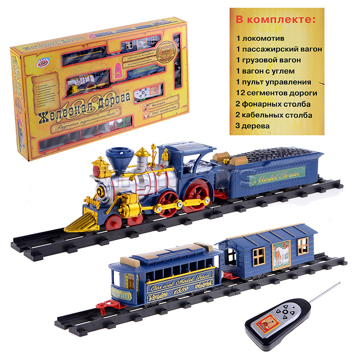 Код: 009020 Страна производитель: Китай Размеры упаковки: 53 x 7 x 32 см Количество в коробке: 24 • В наборе: - локомотив - работает от 4-х батареек 1.5 V "АА" (не входят в комплект). - пульт управления - работает от 2-х батареек 1.5 V "АА" (не входят в комплект). - 3 вагона. - 12 сегментов дороги. - аксессуары (7 шт.) • Функции: - движение вперёд, назад, ускорение. - свет прожектора. - мелодия. • Протяжённость пути - 288 см. • Ширина колеи: 4 см. • Материалы: пластик. • Соответствует требования безопасности продукции. • Для детей от 3-х лет. Комментарии к товару