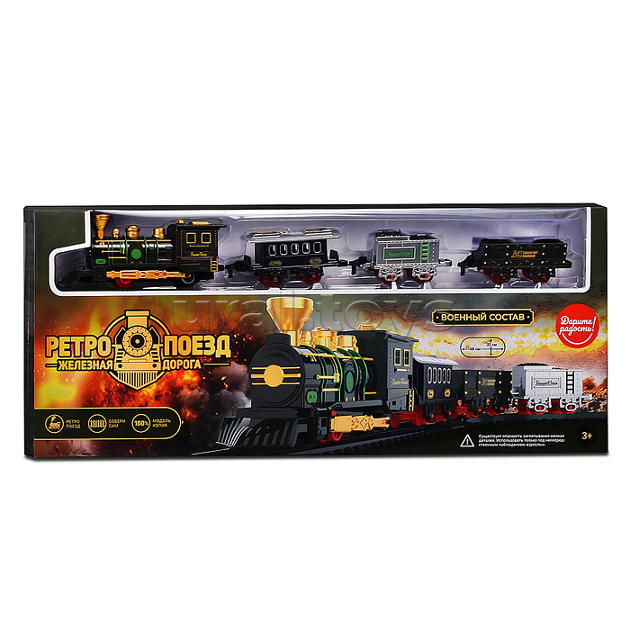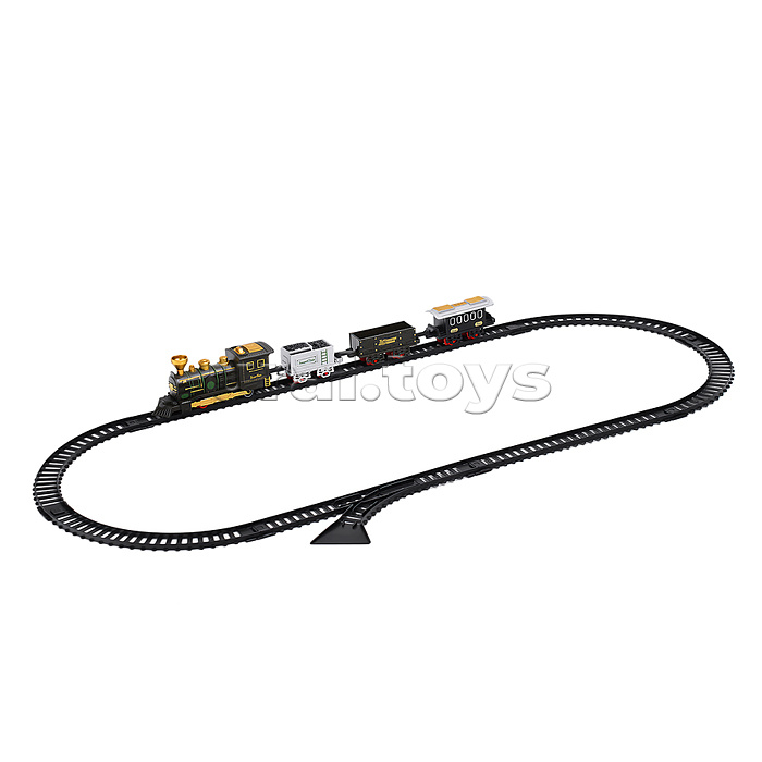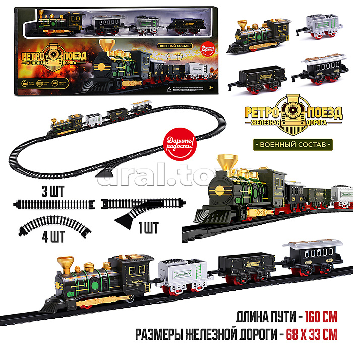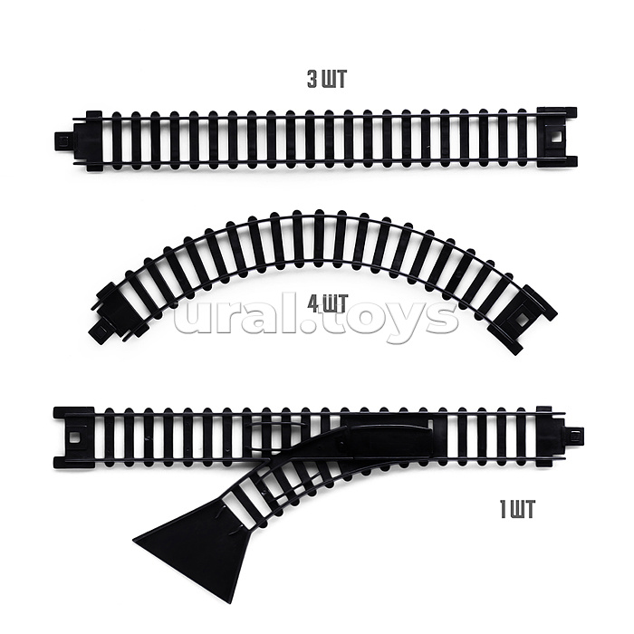 • В наборе: - локомотив (12х3х4.5 см.) - 3 вагона (7х2.5х4 см.) - 8 сегментов дороги • Функции локомотива: движение вперёд. • Размеры собранной железной дороги: 68 х 33 см. • Ширина колеи: 2 см. • Локомотив работает от 1 батарейки АА (не входят в комплект). • Материал: пластик. • Соответствует требованиям безопасности и стандартам качества продукции. • Для детей от 3-х лет.