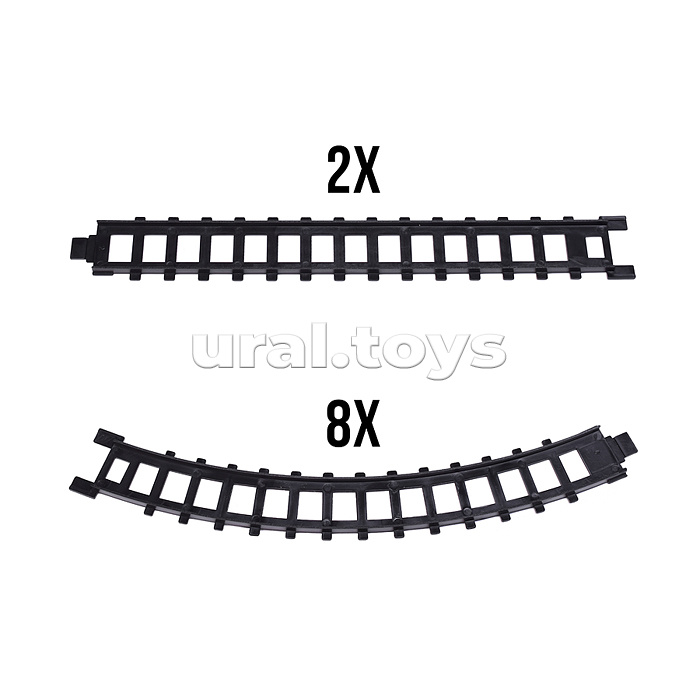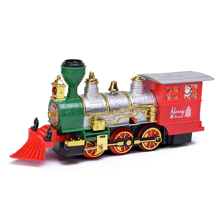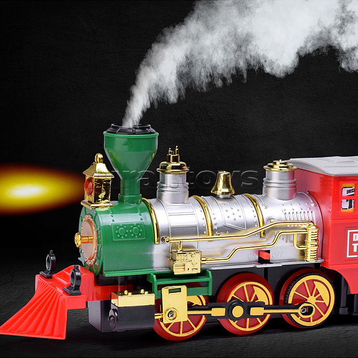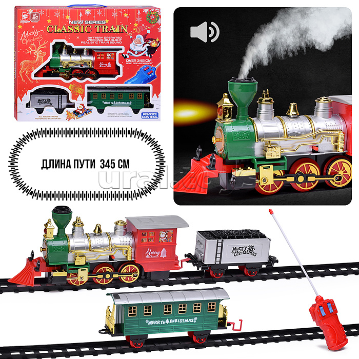 Код: 486004 Штрихкод: 6904111592994 Страна производитель: Китай Размеры упаковки: 41 x 33 x 8 см Количество в коробке: 9 • В наборе 14 деталей: - локомотив (25х6х12 см.) - пассажирский вагон (19х5х8.5 см.) - вагон с углём (14х5х7 см.) - пульт ДУ. - изогнутые рельсы (8 шт.), - прямые рельсы (2 шт.), - бутылка для воды. • Функции локомотива: - движение вперёд. - движение назад. - звук движения локомотива. - свет прожектора. - пар из трубы (при наличии воды в резервуаре) • Протяжённость пути: 345 см. • Ширина колеи: 4 см. • Локомотив работает от 4-х батареек АА (не входят в комплект). • Пульт управления работает от 2-х батареек АА (не входят в комплект). • Материал: пластик. • Соответствует требованиям безопасности и стандартам качества продукции. • Для детей от 3-х лет. Комментарии к товару