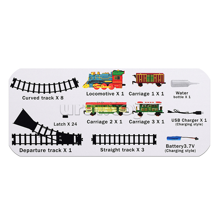 Код: 463677 Штрихкод: 6933116067374 Страна производитель: Китай Размеры упаковки: 41.9 x 43.2 x 7 см Количество в коробке: 12 • В комплекте: - локомотив (18х4.5х7.5 см.) - вагон для аккумулятора (12х4.5х5.5 см.) - пассажирский вагон (28х4.5х6 см.) - 12 сегментов рельс. • Функции локомотива: - движение вперёд, - светящийся прожектор, - реалистичные звуки поезда, - рождественская мелодия. - дым из трубы (при наличии воды). • Ширина колеи: 3.2 см. • Локомотив работает от аккумулятора "3.7V 500 mAh" (входит в комплект) • Материал: пластмасса. • Соответствует требованиям безопасности продукции. • Для детей от 3-х лет. Комментарии к товару