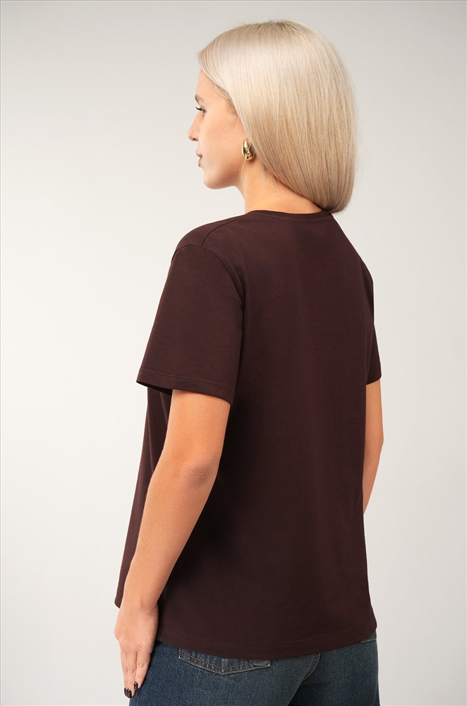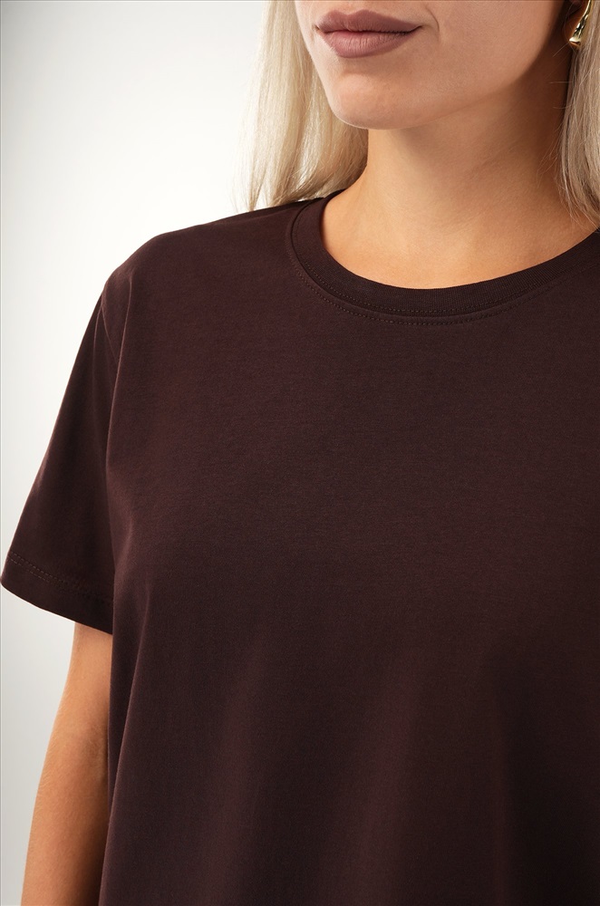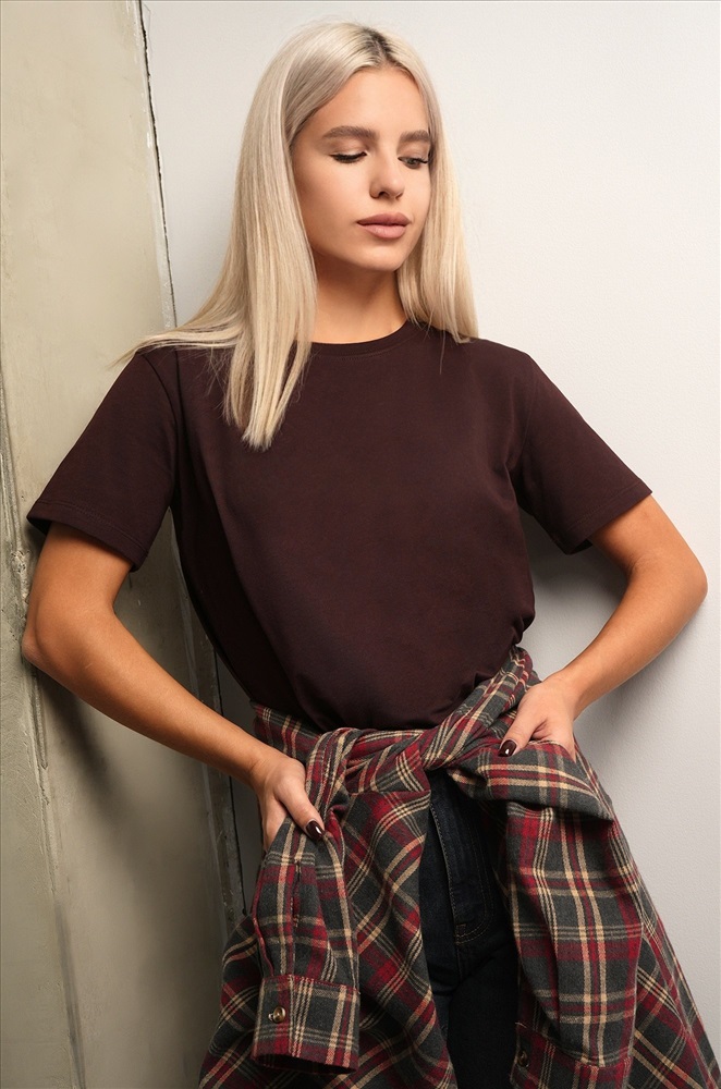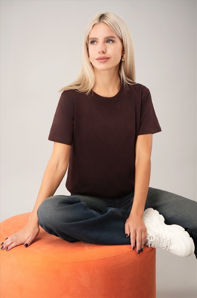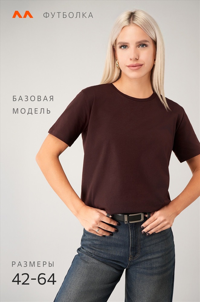 Преимущества: — лаконичная футболка выполнена из натурального 100% хлопка; — базовая футболка из трикотажа кулирная гладь (150 г/м2) отличается дышащими свойствами; — коричневая футболка универсальна и легко сочетается с любыми элементами гардероба; — футболка прямого кроя с коротким рукавом отлично садится на разные типы фигур и не стесняет движений; — хлопковая футболка для женщин выдерживает многократные стирки, сохраняя форму и цвет; Трикотажная футболка шоколадного цвета станет стильной основой образов в стиле кэжуал.
