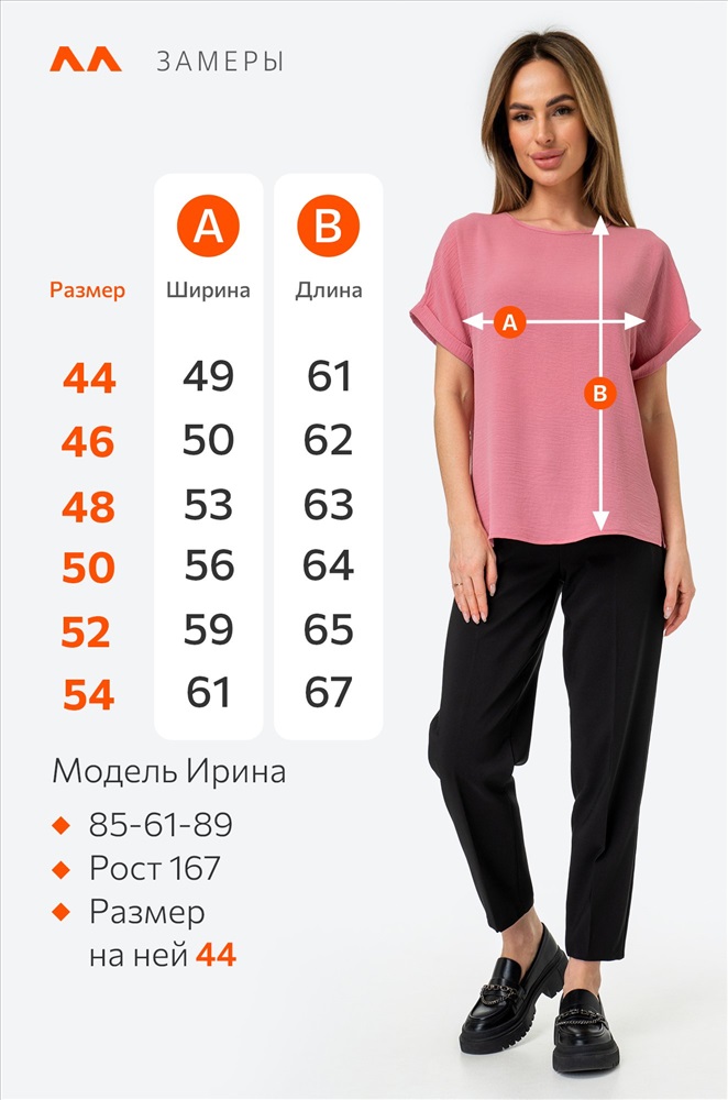 Размер 44: длина:61 см; ширина:49 см; длина рукава внешняя:24 см; длина рукава внутренняя:5 см.