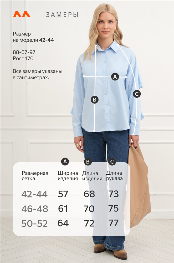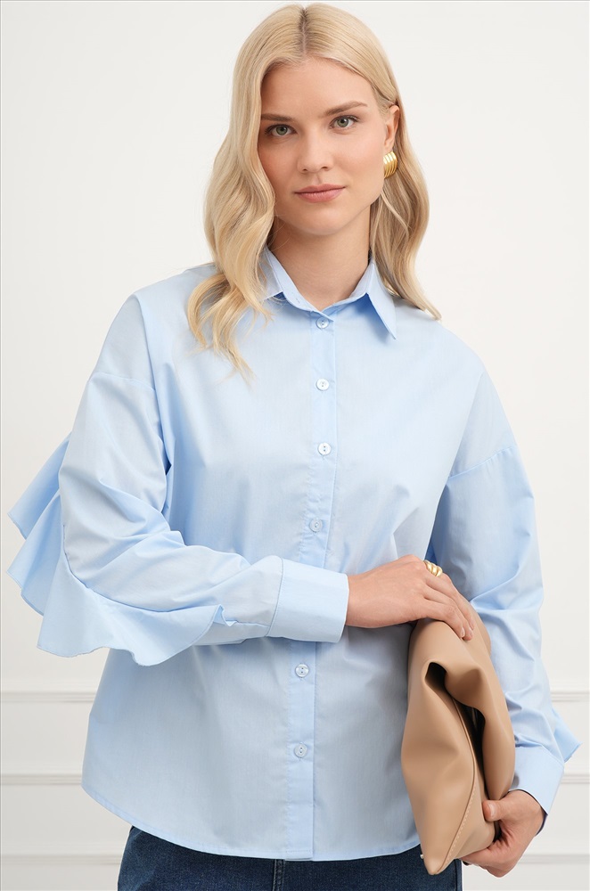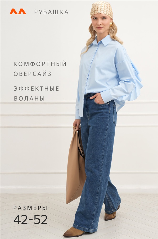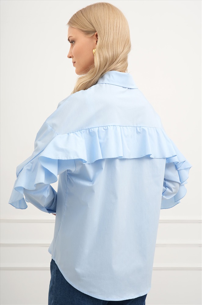 Голубая женская рубашка оверсайз создана для романтичных и смелых образов. Нарядная рубашка с воланами добавляет воздушности и выделяет из толпы.