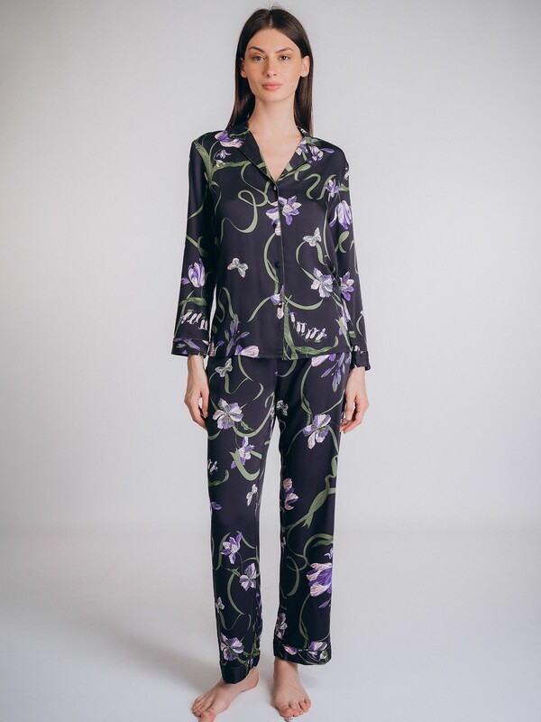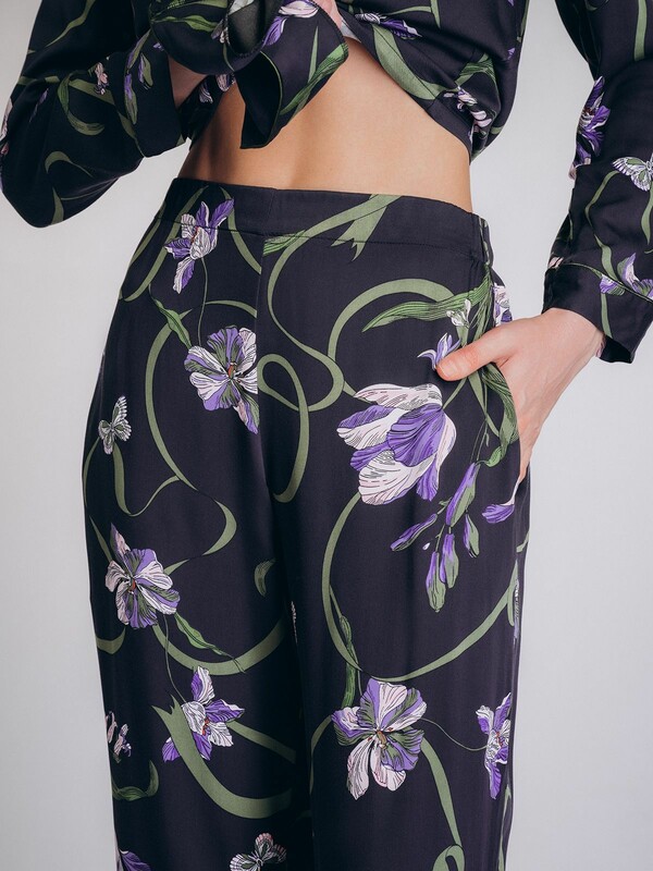 Особенности: Рубашка: с длинными рукавами, украшенными прошитыми заворотами. На рубашке расположены тканевые пуговицы, которые добавляют элегантности. Край рубашки и воротник декорированы тонкой зелёной оборкой Брюки: свободного кроя, с прошитыми заворотами, обеспечивающими аккуратный вид. Пояс выполнен из эластичной резинки, что гарантирует удобную посадку. Принт: тёмный фон с цветочным узором в зелёных и фиолетовых тонах. 100% Вискоза Комментарии к товару