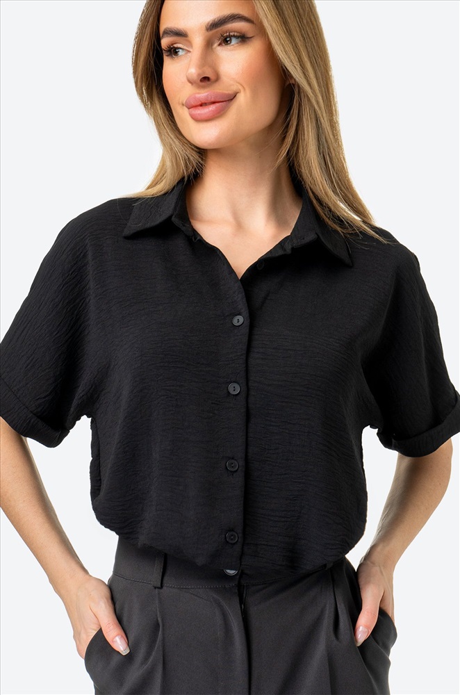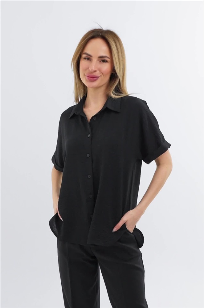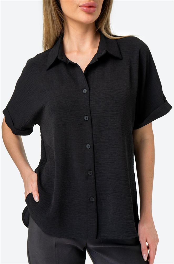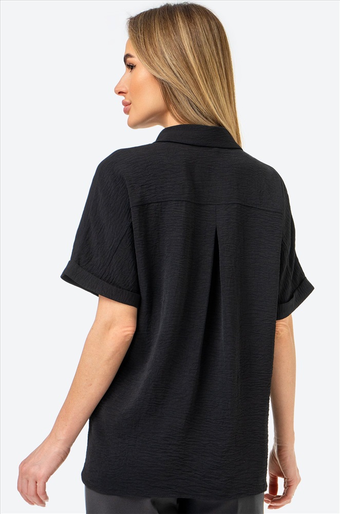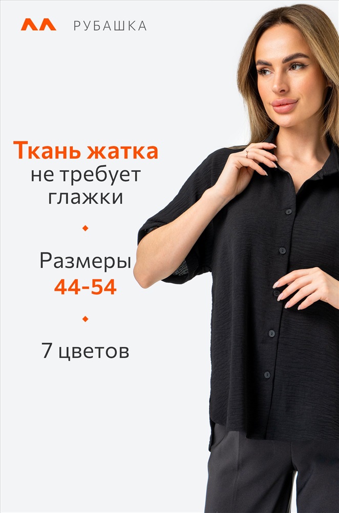 Забудьте про глажку! Рубашка для женщин выполнена из ткани жатка, которая не мнется. Благодаря своим свойствам черная рубашка красиво драпируется на теле, создавая воздушные складки и небрежные линии. Свободный крой дарит максимальный комфорт. Вы будете чувствовать себя уверенно в любой ситуации. Короткие рукава добавляют особую изюминку и делают эту рубашку из вискозы универсальной – она подойдет как для прохладных летних вечеров, так и для праздничных мероприятий. Однотонная рубашка с отложным воротником – стильная база, которая дополнит офисный образ на каждый день. Подойдет для прогулок и для офиса. Широкий размерный ряд, есть большие размеры.