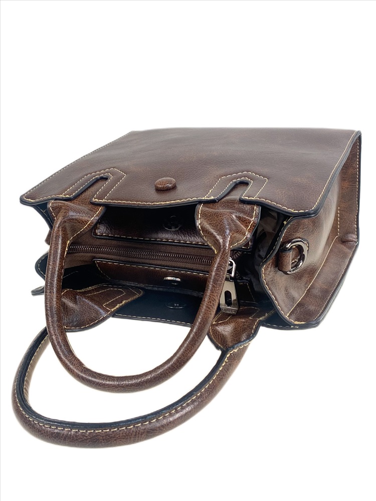 Элегантная женская сумка из искусственной кожи. Сумка имеет три отделения: центральное закрывается на молнию, два крайних на магнитные кнопки. Внутри центрального отделения дополнительный карман на молнии и открытый карман. В комплекте длинный плечевой ремень.