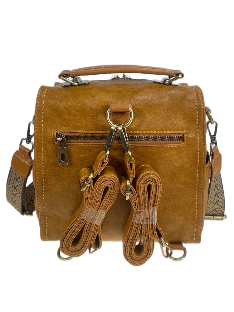 Компактная женская сумка-рюкзак из искусственной кожи. Сумка закрывается на молнию, внутри два кармана на молнии и открытый карман. Снаружи на передней стенке карман на молнии и два накладных кармана на магнитных кнопках. На задней стенке два ремня и карман на молнии. В комплекте широкий текстильный плечевой ремень .