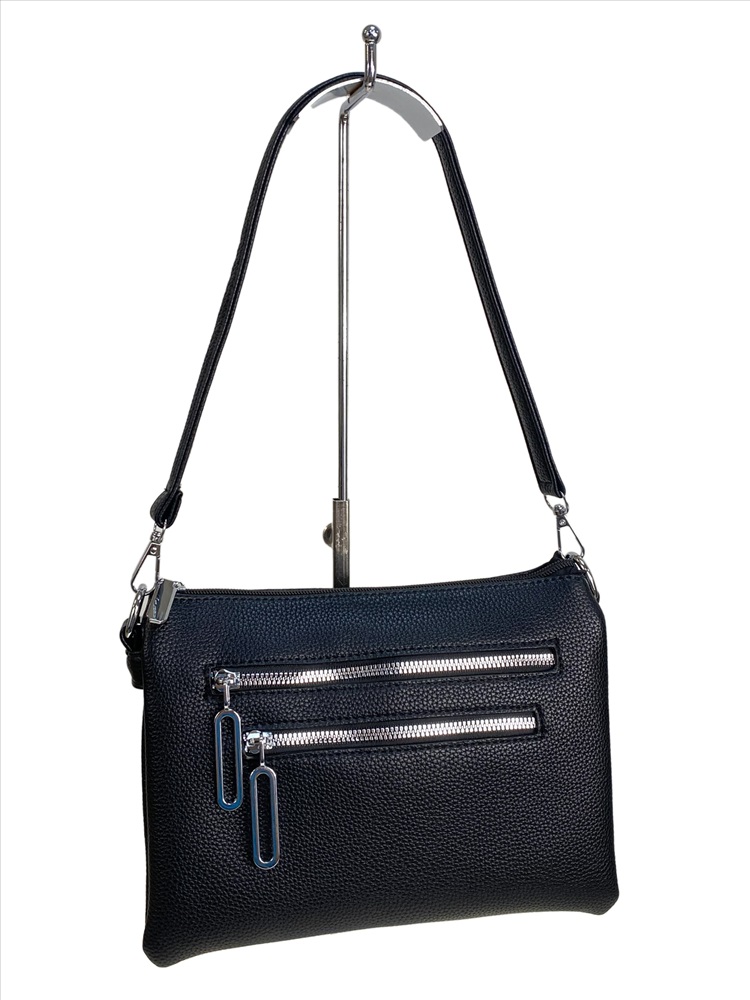 Элегантная и компактная женская сумка из искусственной кожи. Сумка закрывается на молнию, внутри три отделения, центральное закрывается на молнию, два боковых кармана открыты, внутри дополнительный карман на молнии и открытый карман. Сумка имеет удобную ручки и длинный ремень, регулируется по длине. Снаружи, на передней стенке два прорезных кармана на молнии. На задней стенке карман на молнии.
