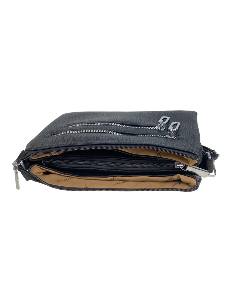Элегантная и компактная женская сумка из искусственной кожи. Сумка закрывается на молнию, внутри три отделения, центральное закрывается на молнию, два боковых кармана открыты, внутри дополнительный карман на молнии и открытый карман. Сумка имеет удобную ручки и длинный ремень, регулируется по длине. Снаружи, на передней стенке два прорезных кармана на молнии. На задней стенке карман на молнии.