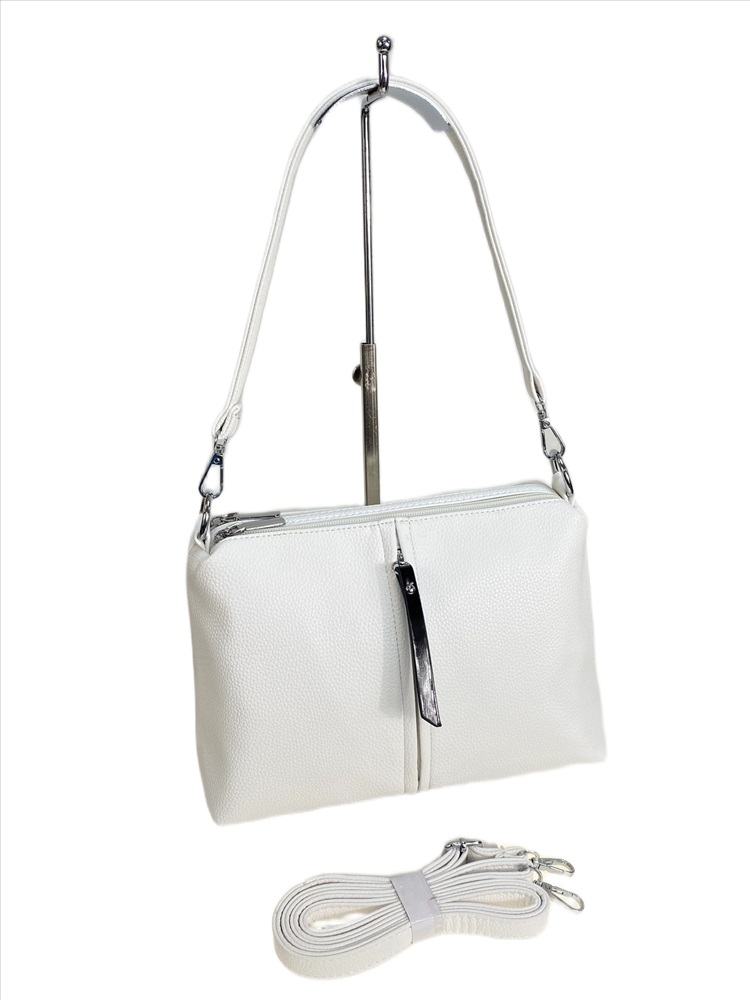 Элегантная женская сумка из мягкой искусственной кожи. Сумка имеет два отделения, каждое закрывается на молнию, внутри дополнительный карман на молнии и два открытых кармана. Снаружи, на передней стенке прорезной карман на молнии. На задней стенке карман на молнии. В комплекте удобная ручка и длинный плечевой ремень.