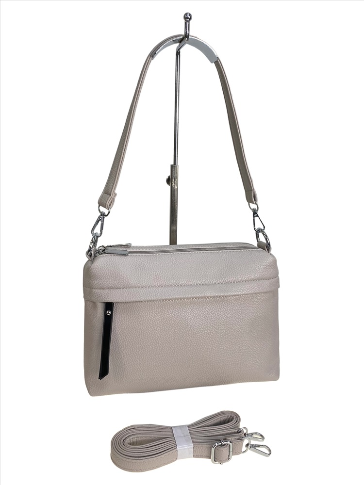 Элегантная женская сумка из мягкой искусственной кожи. Сумка имеет два отделения, каждое закрывается на молнию, внутри дополнительный карман на молнии и два открытых кармана. Снаружи, на передней стенке прорезной карман на молнии. На задней стенке карман на молнии. В комплекте удобная ручка и длинный плечевой ремень.