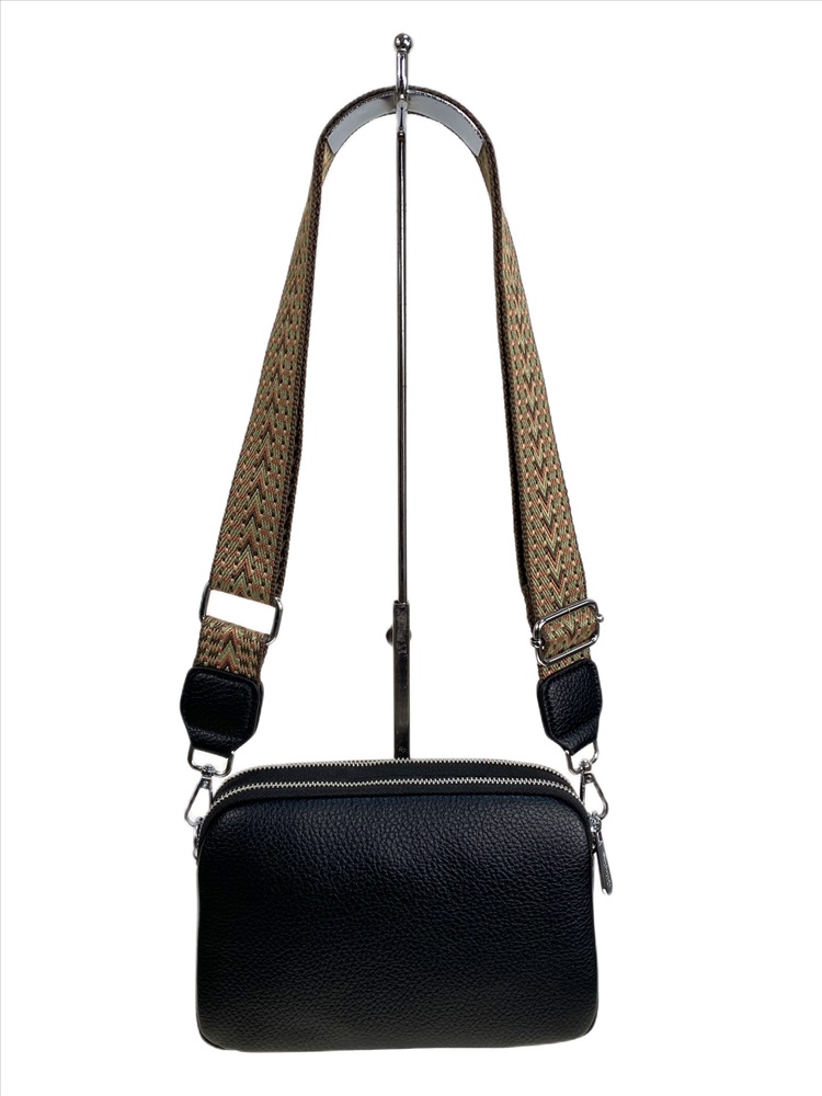 Комактная женская сумка из искусственной кожи. Сумка имеет два отделения, каждое закрывается на молнию, внутри дополнительный открытый карман и карман на молнии. В комплекте широкий текстильный плечевой ремень.