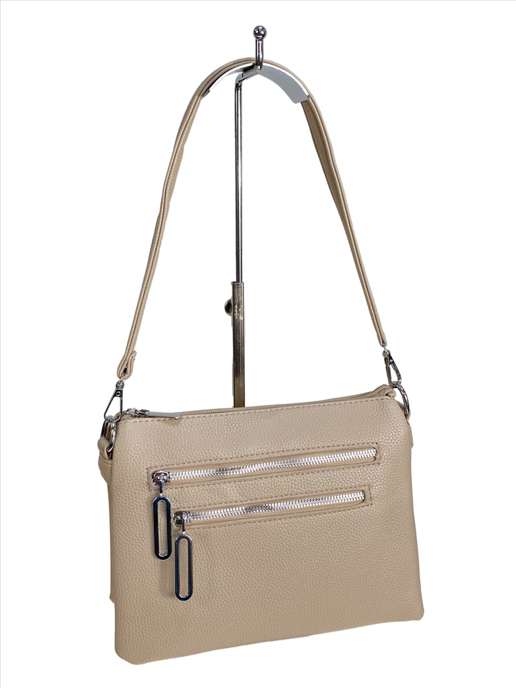 Элегантная и компактная женская сумка из искусственной кожи. Сумка закрывается на молнию, внутри три отделения, центральное закрывается на молнию, два боковых кармана открыты, внутри дополнительный карман на молнии и открытый карман. Сумка имеет удобную ручки и длинный ремень, регулируется по длине. Снаружи, на передней стенке два прорезных кармана на молнии. На задней стенке карман на молнии.