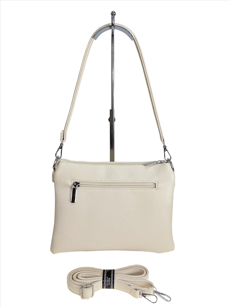 Элегантная и компактная женская сумка из искусственной кожи. Сумка закрывается на молнию, внутри три отделения, центральное закрывается на молнию, два боковых кармана открыты, внутри дополнительный карман на молнии и открытый карман. Сумка имеет удобную ручки и длинный ремень, регулируется по длине. Снаружи, на передней стенке два прорезных кармана на молнии. На задней стенке карман на молнии.