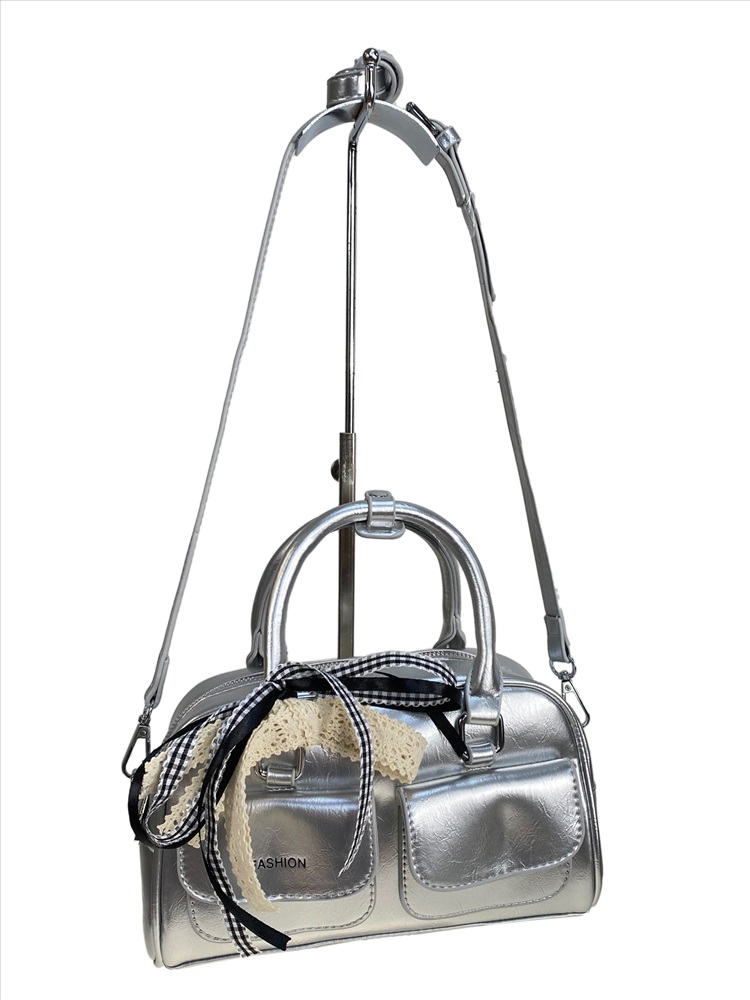 Элегантная женская сумка из искусственной кожи. Закрывается на молнию, внутри одно отделение. Снаружи на передней стенке два кармана на магнитной кнопке. Сумка имеет удобные ручки и длинный плечевой ремень. В комплекте оригинальный брелок.