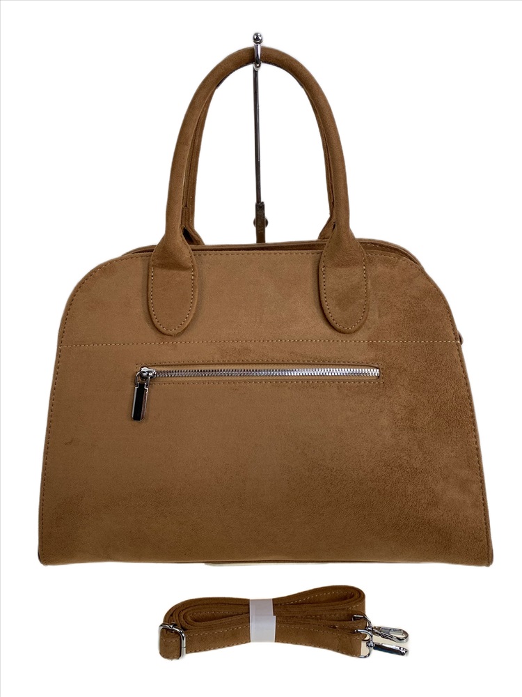 Элегантная женская сумка из искусственной замши. Закрывается на молнию, внутри два отделения разделенных карманом на молнии, дополнительный карман на молнии и открытый карман. Снаружи на задней стенке карман на молнии. В комплекте длинный плечевой ремень.