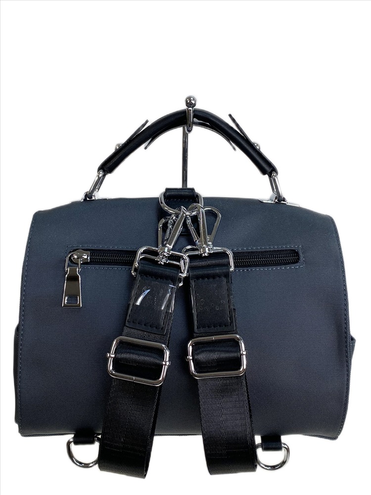 Компактная женская сумка-рюкзак из качественного текстиля. Закрывается на молнию, внутри одно основное отделение, дополнительный карман на молнии и два открытых кармана. Снаружи на передней стенке карман на молнии с брелком. В комплекте широкий текстильный ремень.