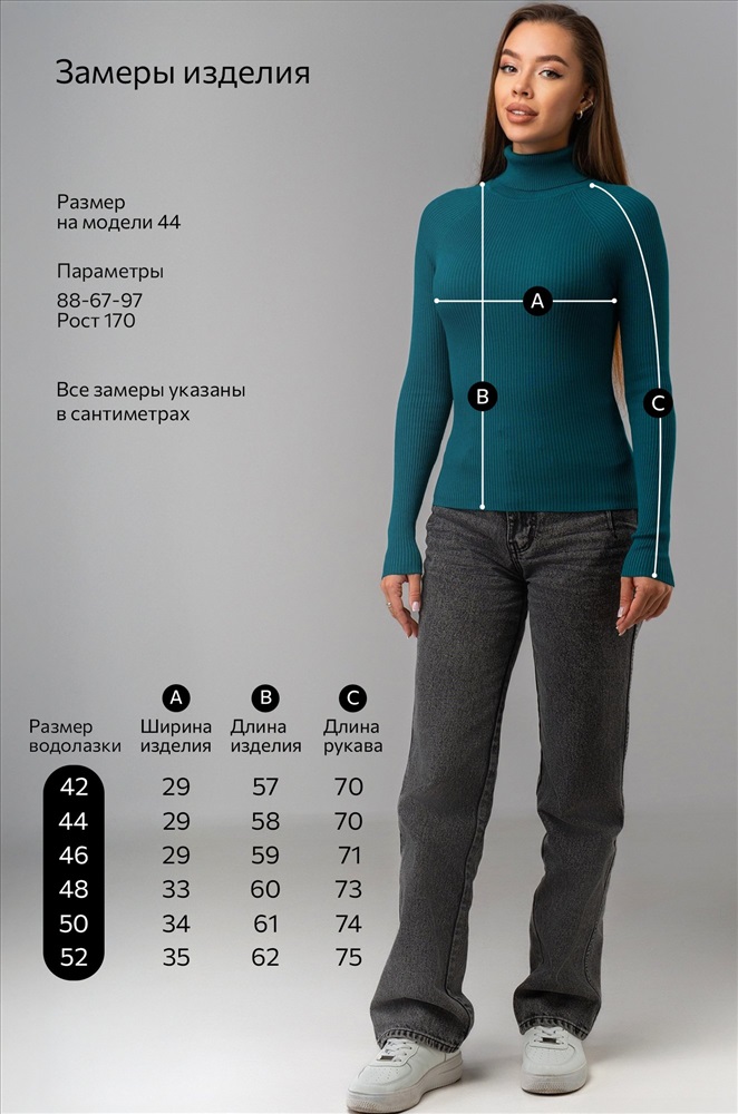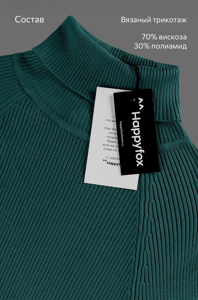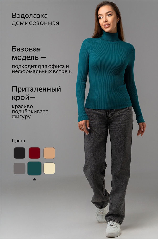 Преимущества: — универсальный базовый элемент гардероба – бадлон подходит для офиса, деловых встреч и ежедневных прогулок; — приталенная водолазка красиво подчёркивает фигуру и повторяет естественные линии тела; — высокий воротник нежно прилегает к шее; — длинные рукава сохраняют тепло и защищают от ветра в прохладную весеннюю и осеннюю погоду; — теплая водолазка выполнена из дышащего, мягкого и приятного к телу вязаного трикотажа в рубчик; — зеленая водолазка легко комбинируется с разным низом. Однотонный бадлон изумрудного цвета для женщин станет незаменимой частью капсульного гардероба: облегающая водолазка одинаково хорошо смотрится в строгом офисном образе и в расслабленном смарт кэжуал стиле.
