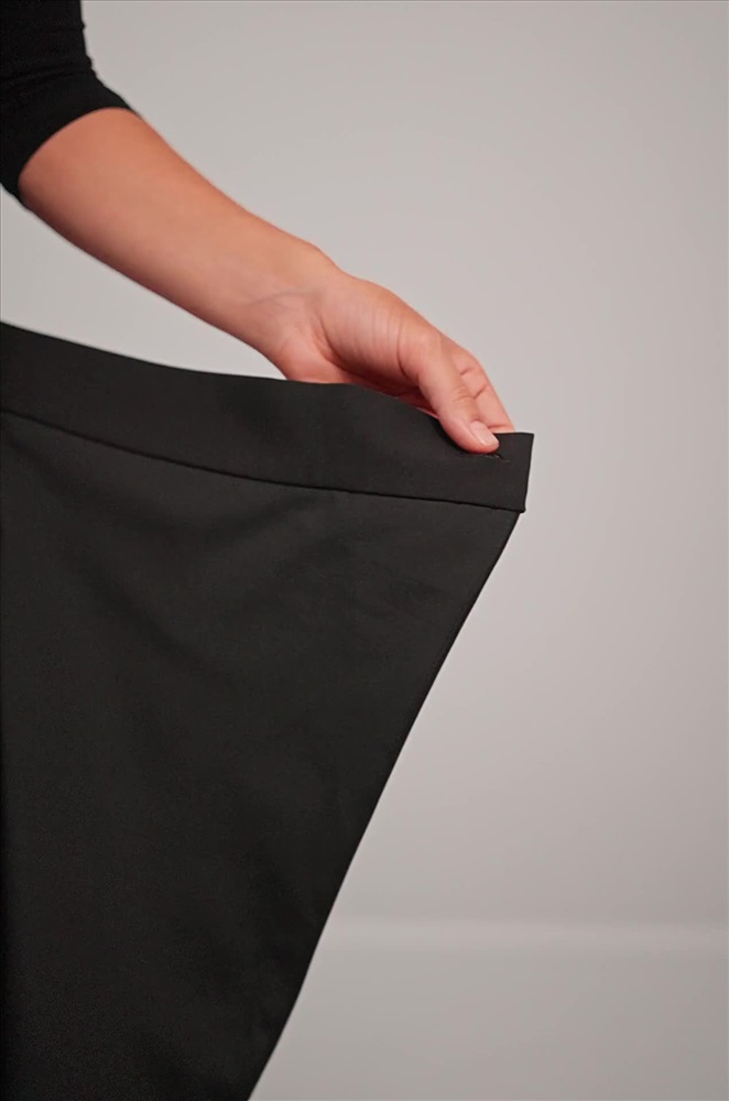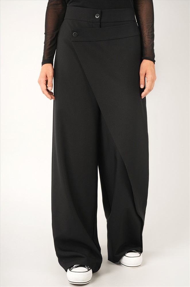 Стильные асимметричные женские брюки в черном цвете — идеальное сочетание комфорта и изящества. Классика с оригинальными элементами в виде запаха и аккуратной застёжки на пуговицу подчеркнёт индивидуальность и подойдёт для девушек и женщин, ценящих практичность и эстетику.