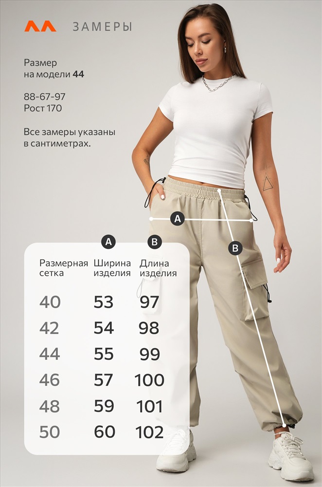 Размер 40:длина по внешнему шву:97 см; длина по внутреннему шву:66 см; ширина по бедрам:53 см.