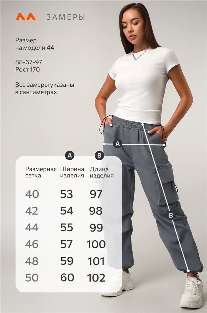 Размер 42:длина по внешнему шву:98 см; длина по внутреннему шву:66 см; ширина по бедрам:54 см. Размер 44:длина по внешнему шву:99 см; длина по внутреннему шву:67 см; ширина по бедрам:55 см. Размер 46:длина по внешнему шву:100 см; длина по внутреннему шву:67 см; ширина по бедрам:57 см. Размер 48:длина по внешнему шву:101 см; длина по внутреннему шву:68 см; ширина по бедрам:59 см. Размер 50:длина по внешнему шву:102 см; длина по внутреннему шву:68 см; ширина по бедрам:60 см. *замеры выборочные, могут незначительно отличаться. Комментарии к товару