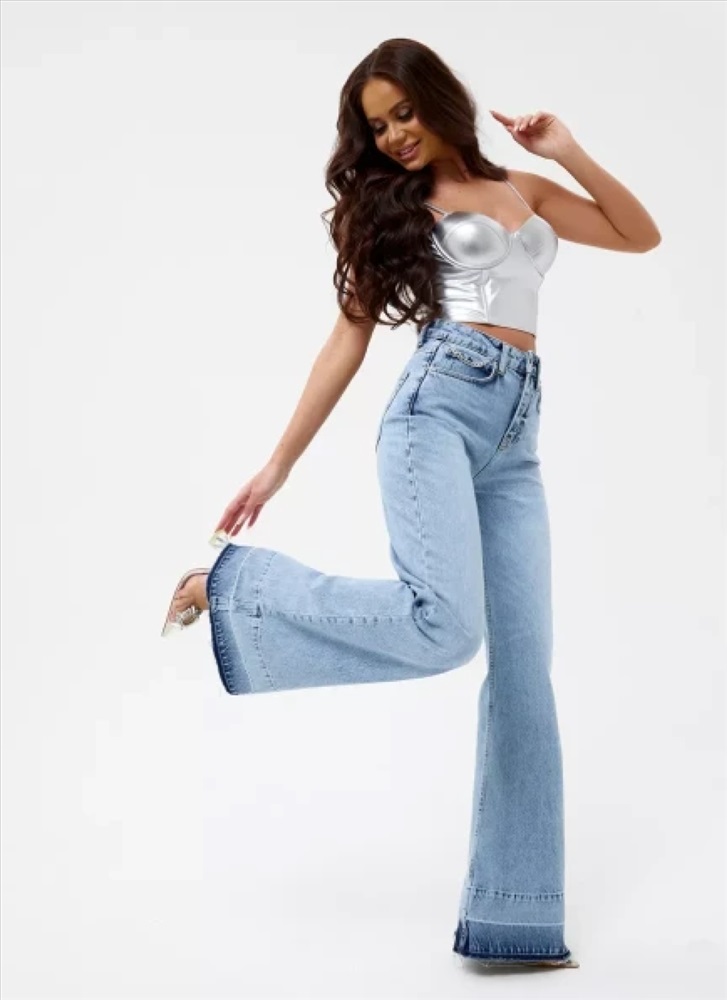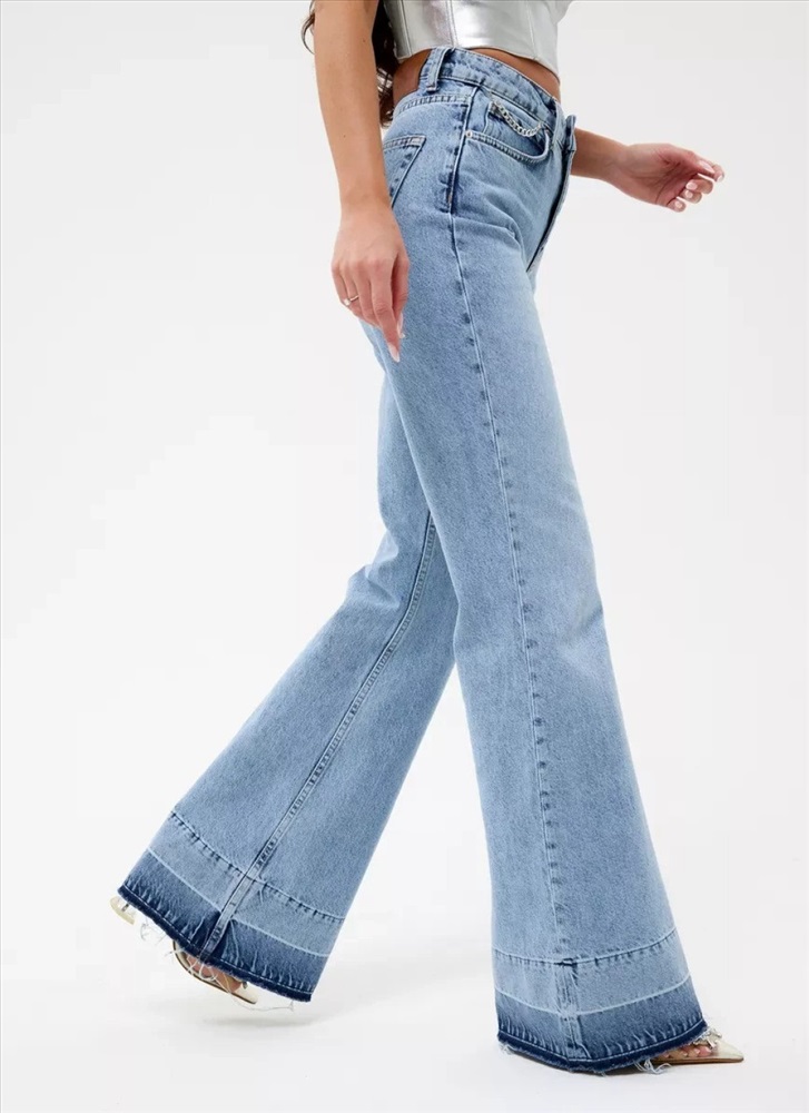 Съёмные цепочки на карманах и необработанный низ делают образ ещё круче. Подойдут и для офиса, и для прогулок. Попробуйте — клёш от колена ещё никогда не был таким удобным!